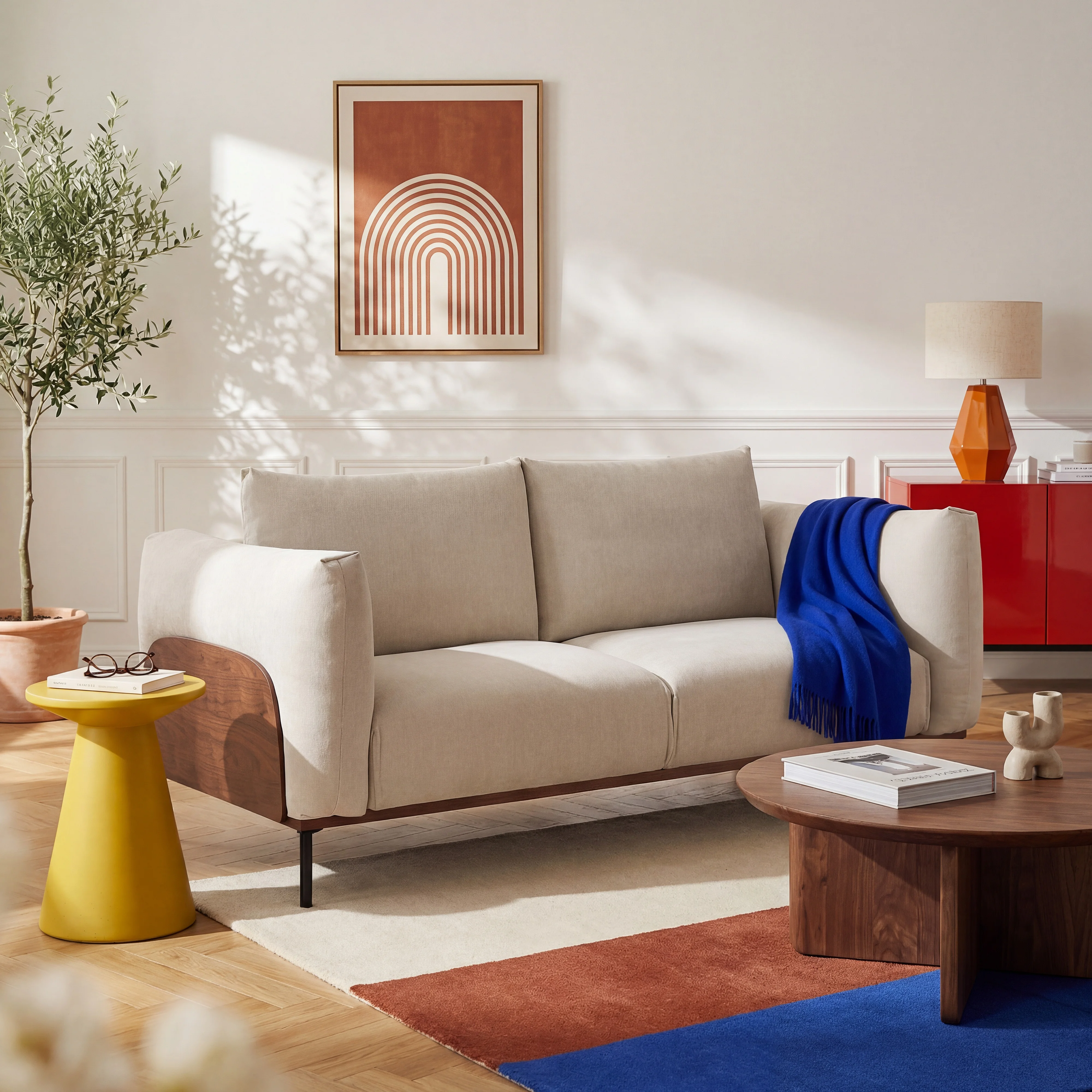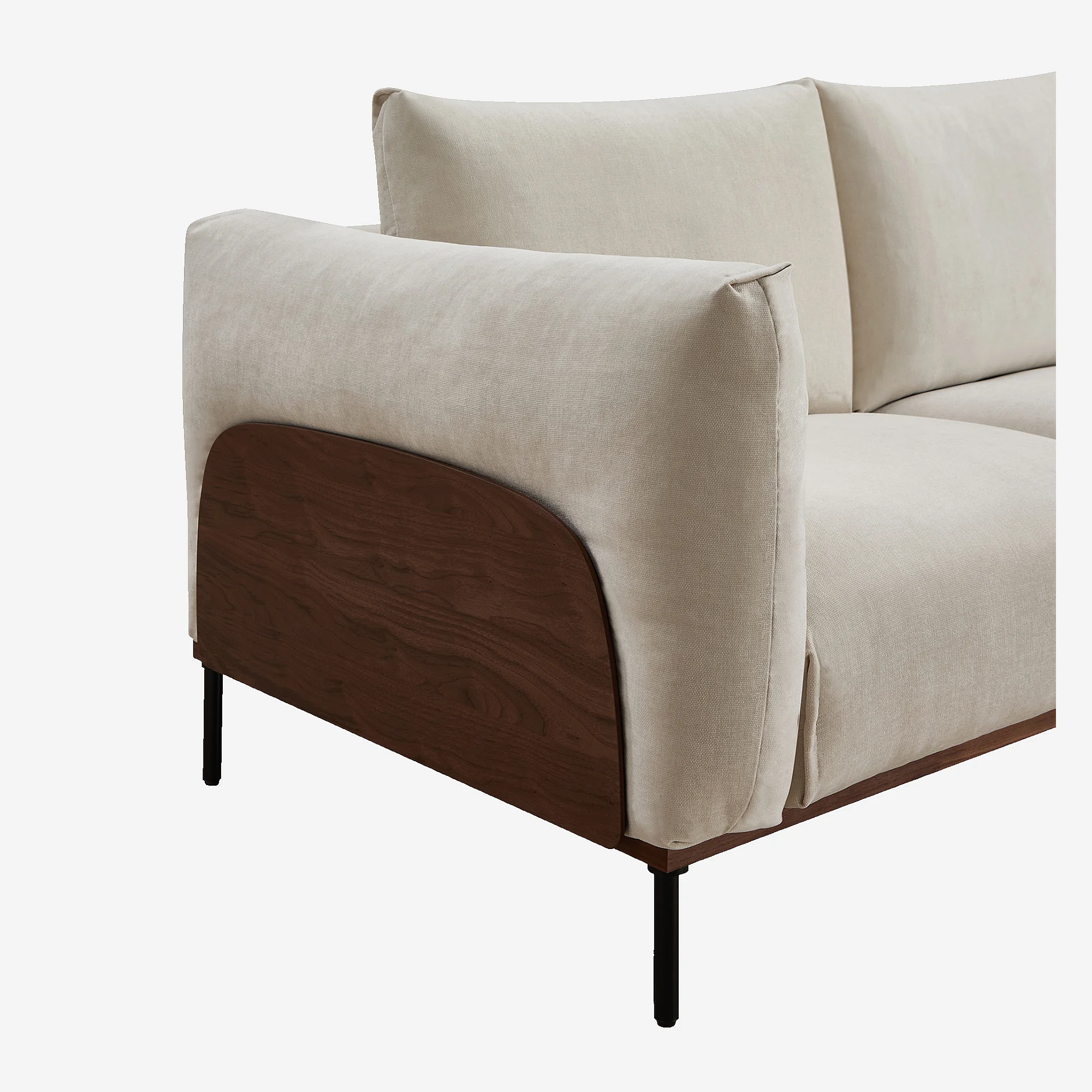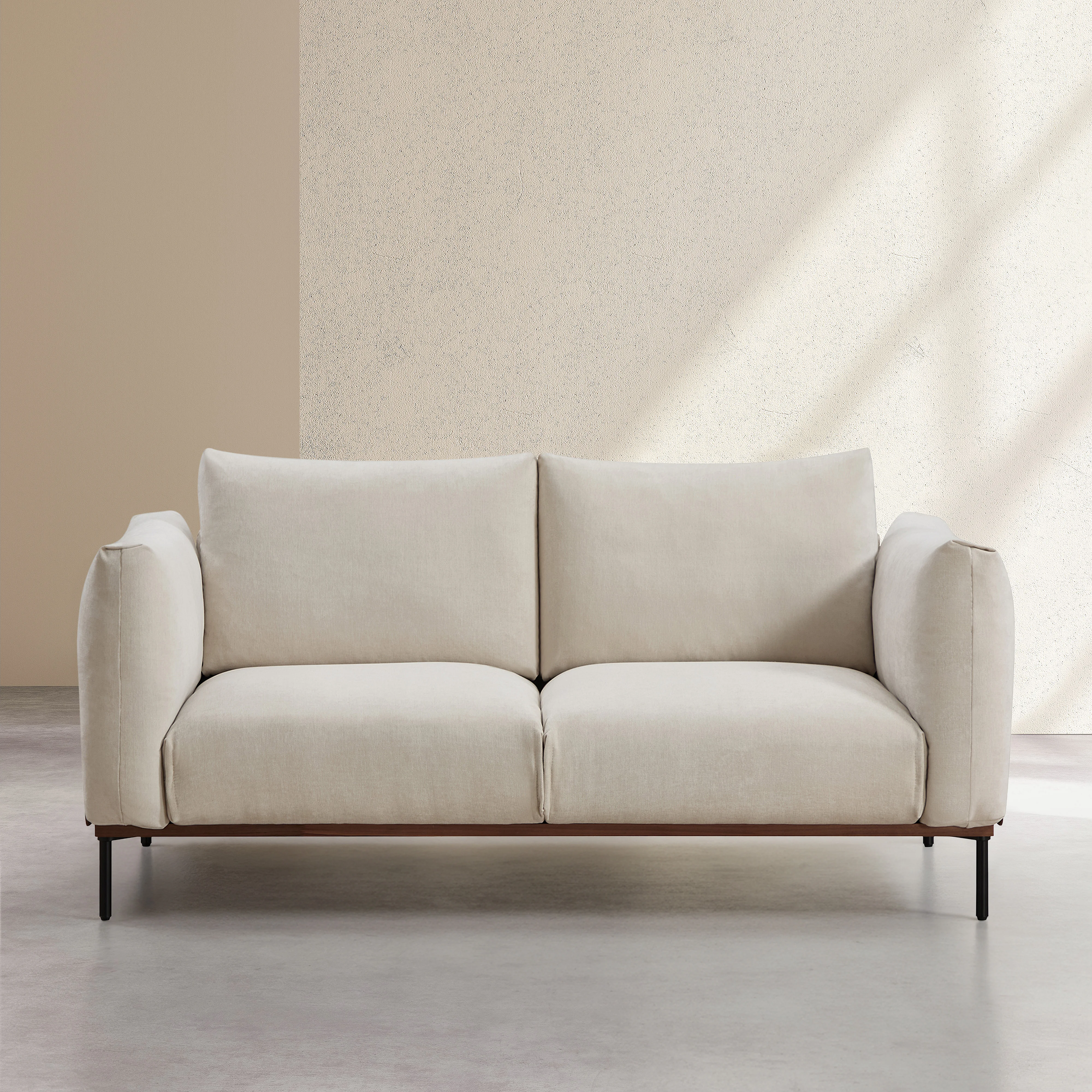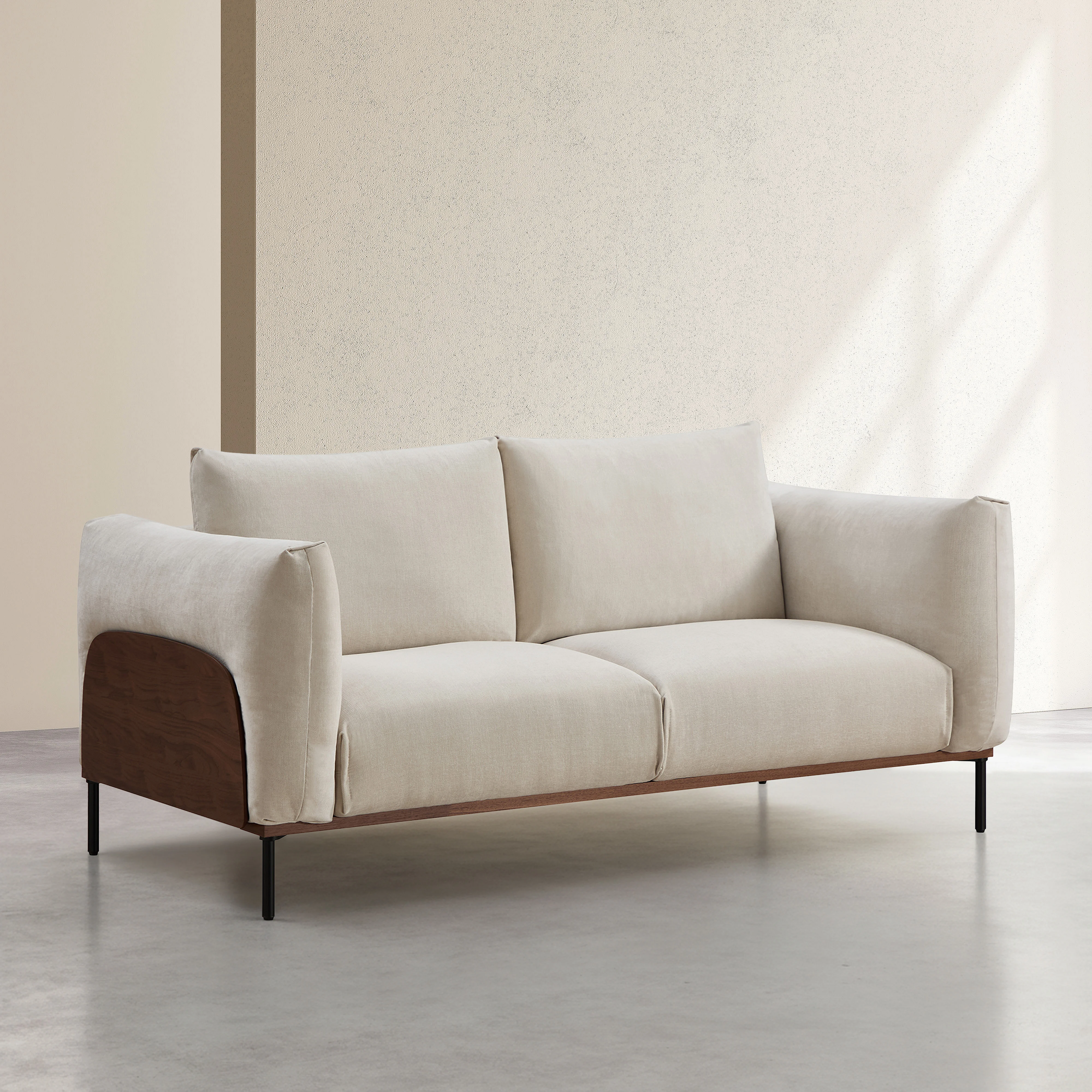 Canapé 2 places en tissu et bois garni de plumes - Sable et noyer