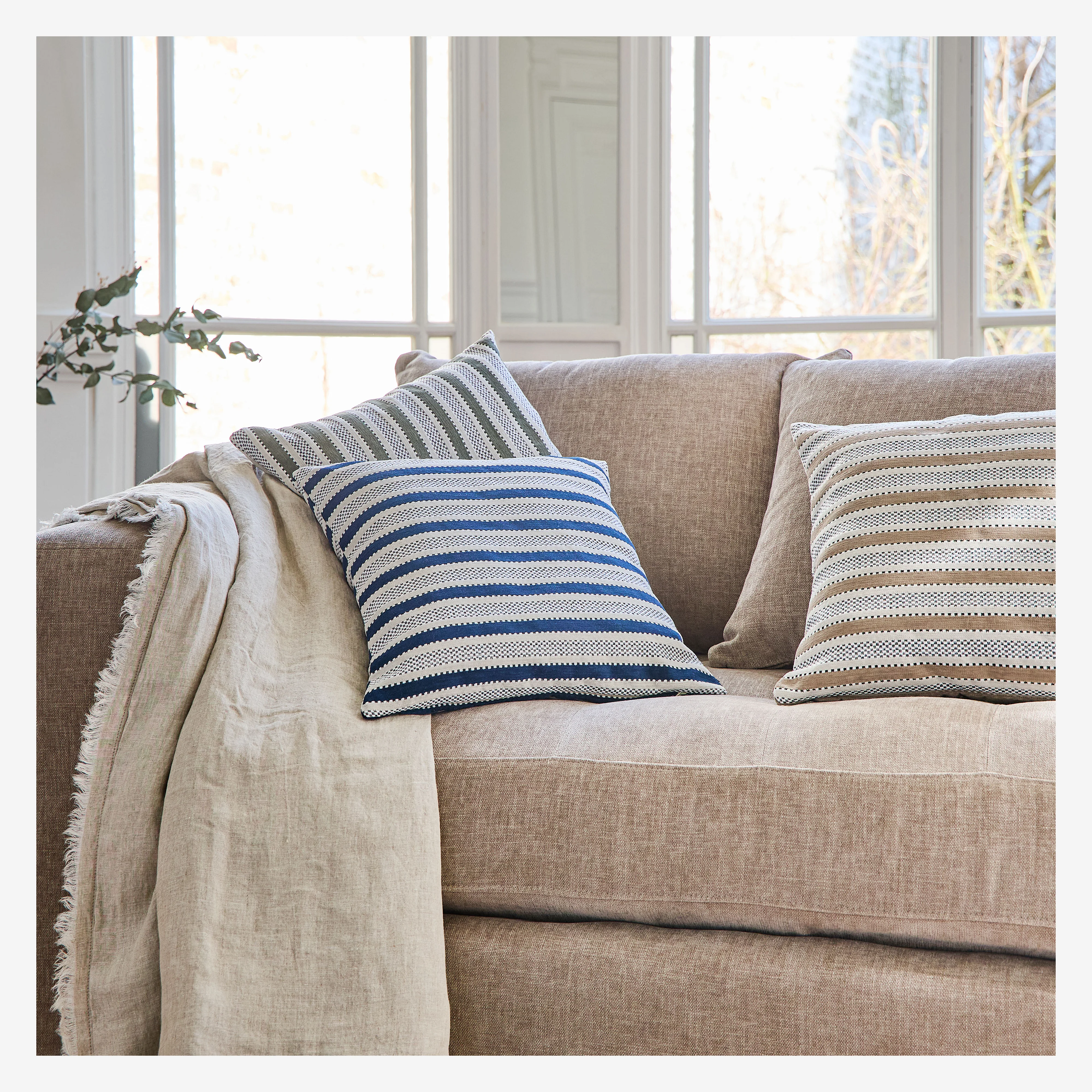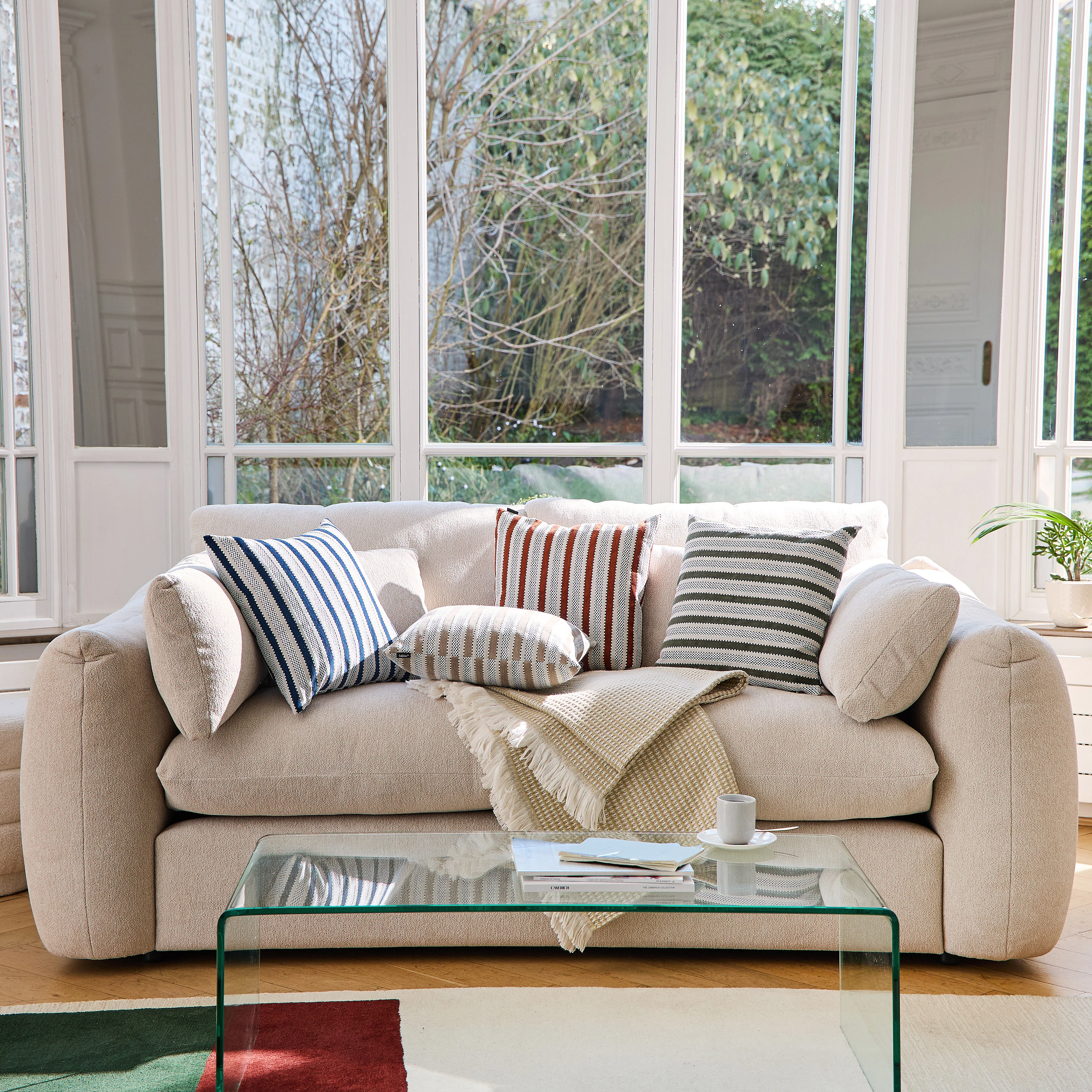 Alliant coton et fibres recyclés dans un jacquard raffiné, le coussin Aristide, conçu en France, présente un motif discret de rayures et de damier, mêlant esprit contemporain et héritage textile pour une élégance colorée.