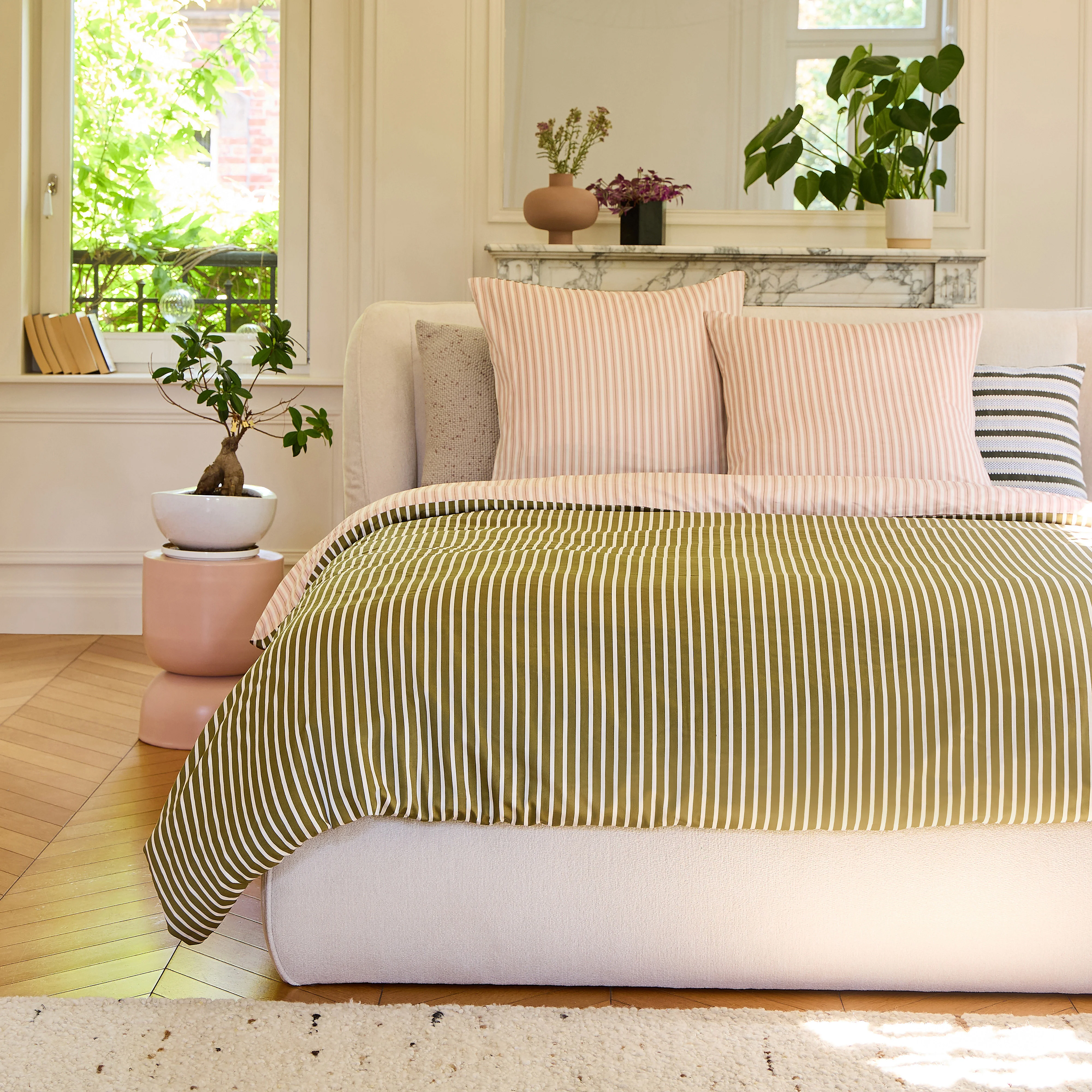 Des rayures poétiques sur un satin de coton bio. Baudouin unit douceur graphique et promesse de bien-être.