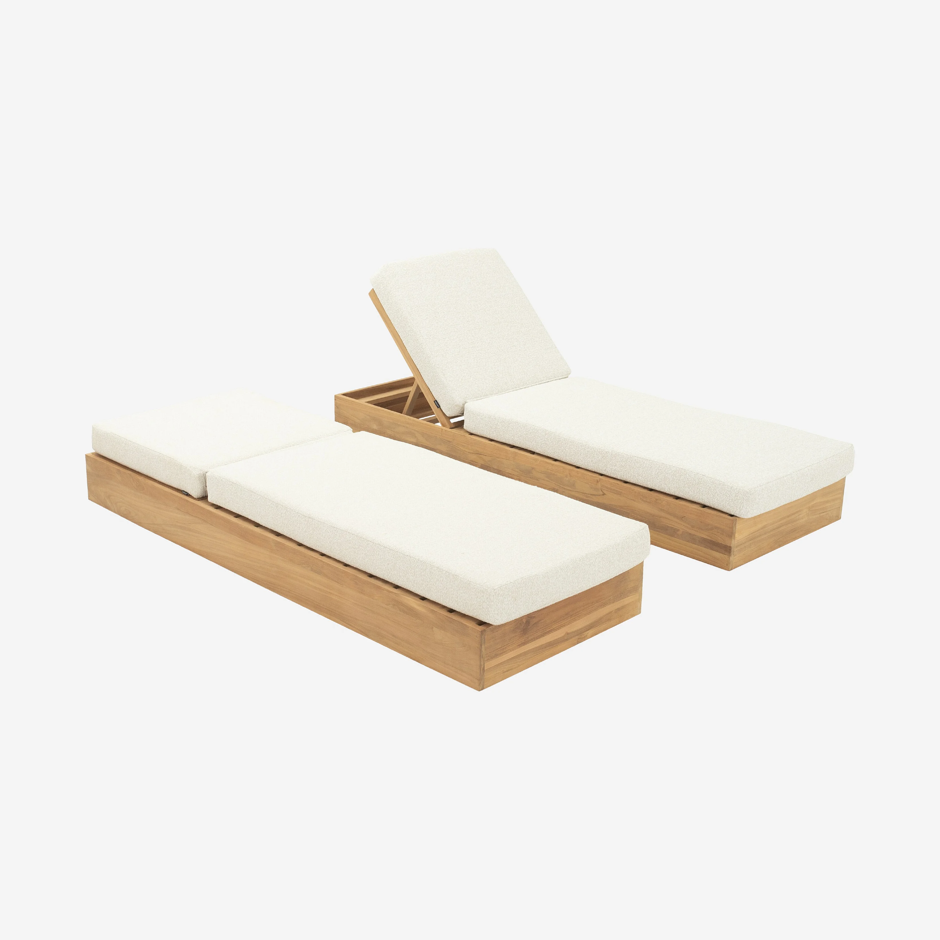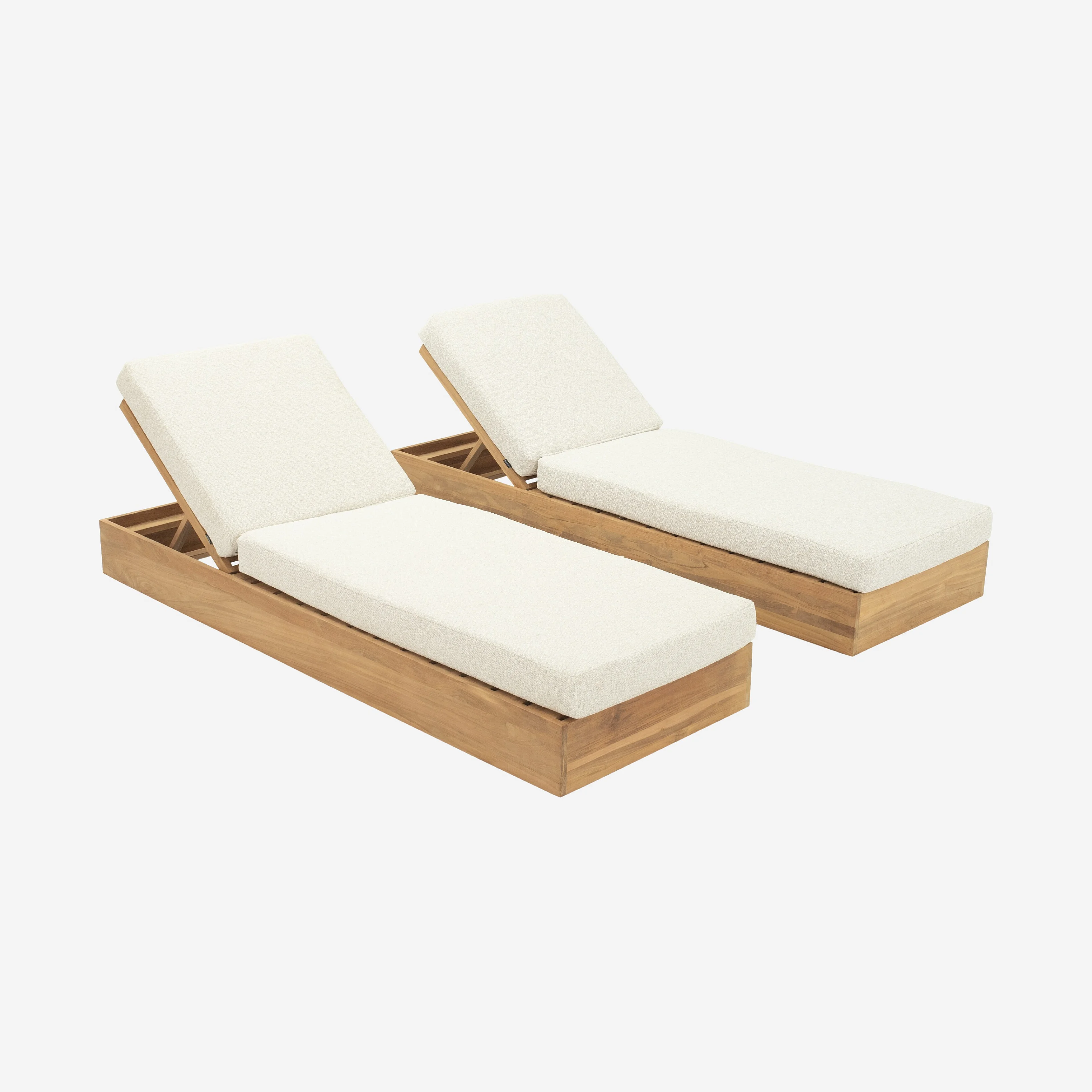 Lot de 2 bains de soleil en teck massif et tissu imperméable - Naturel et blanc cassé