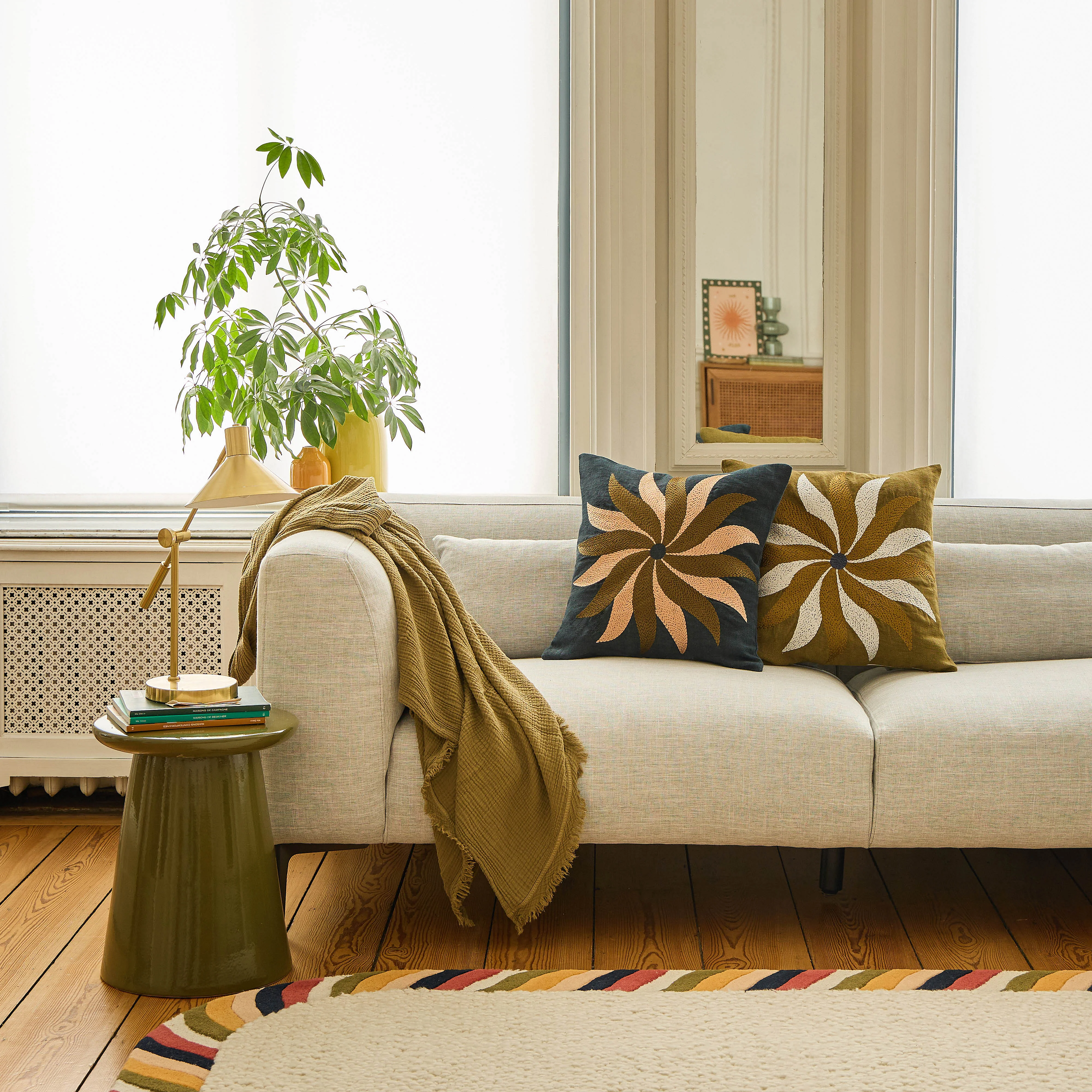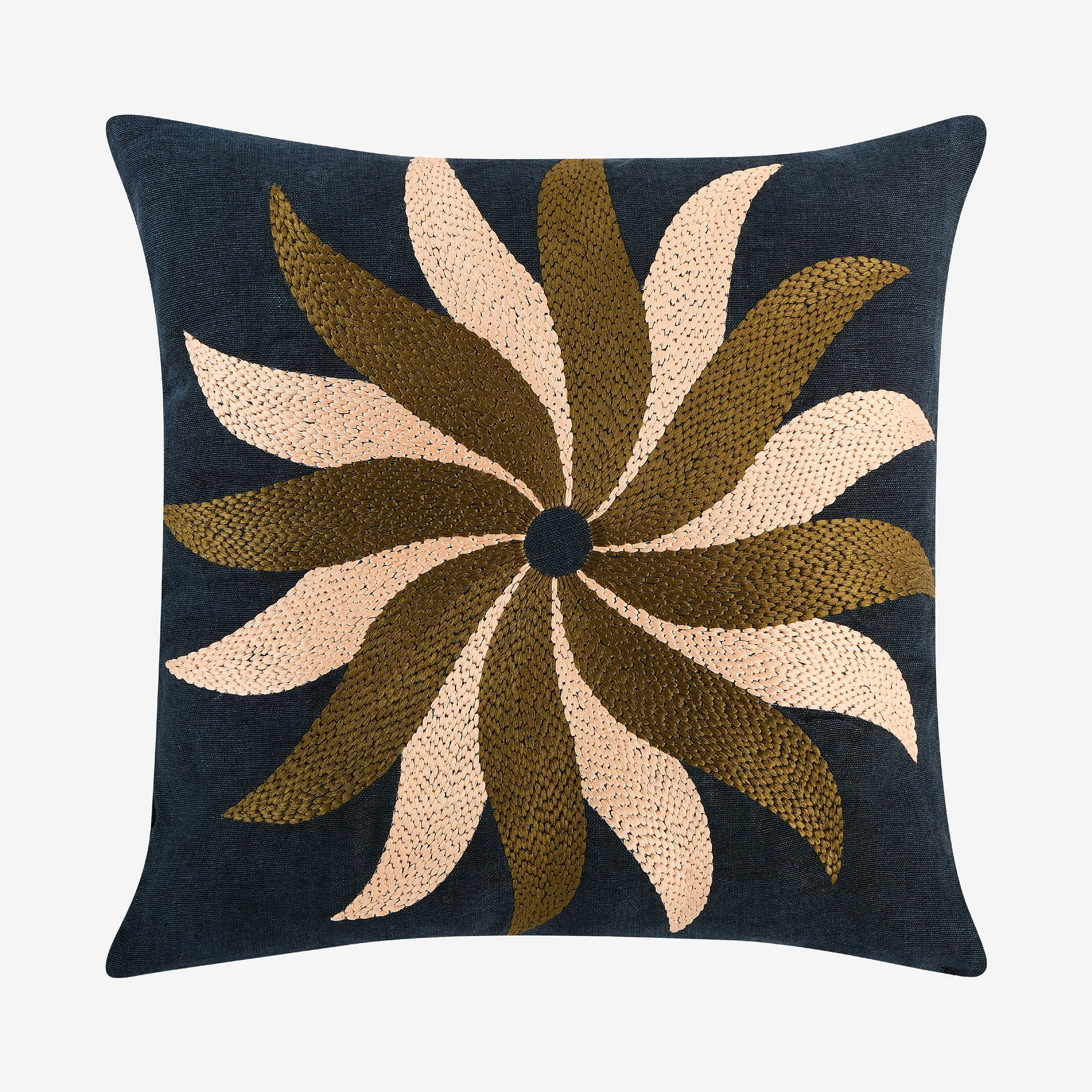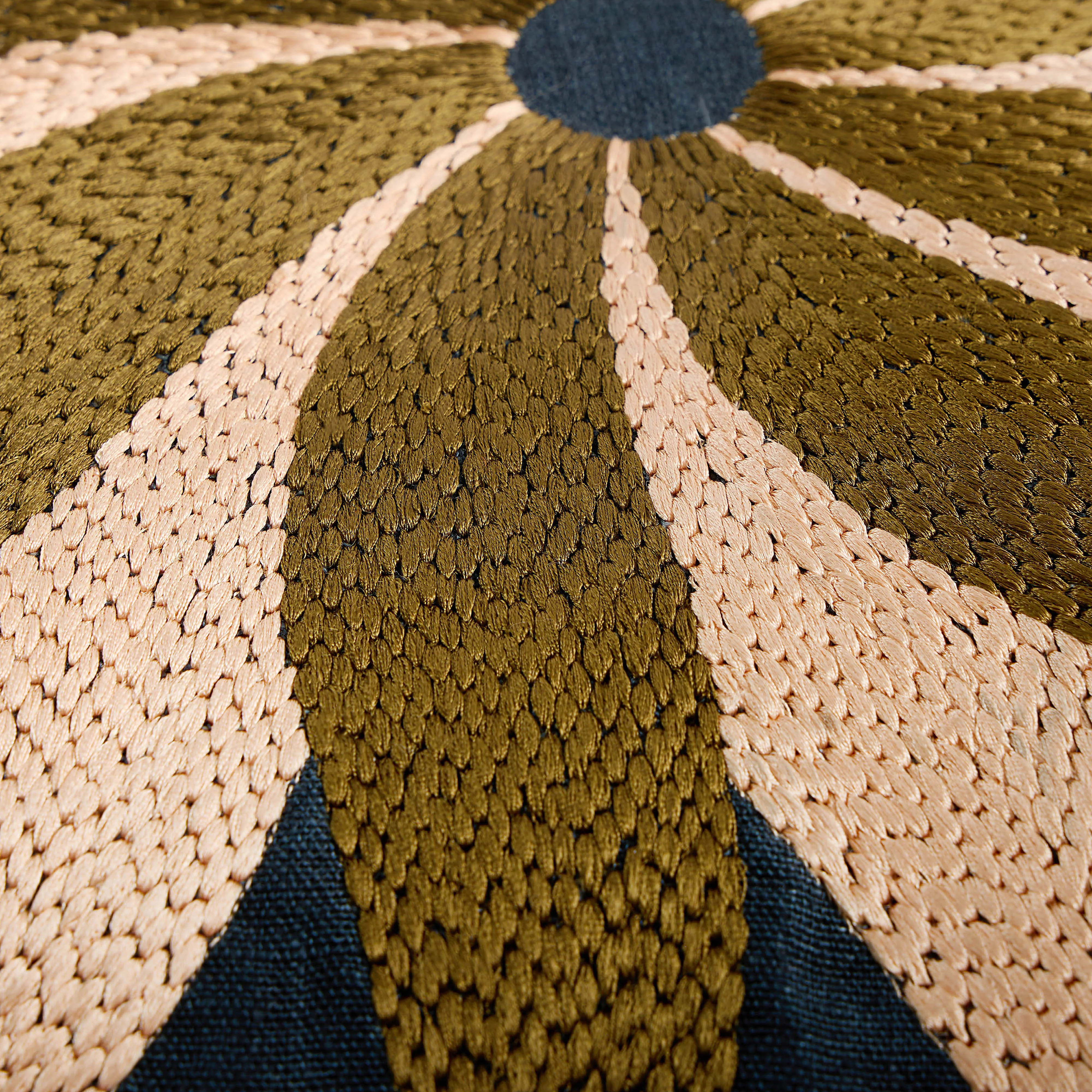 Le coussin Carmen en lin brodé déploie un motif floral et solaire aux reflets irisés, où la matière brute dialogue avec la précision du geste graphique.