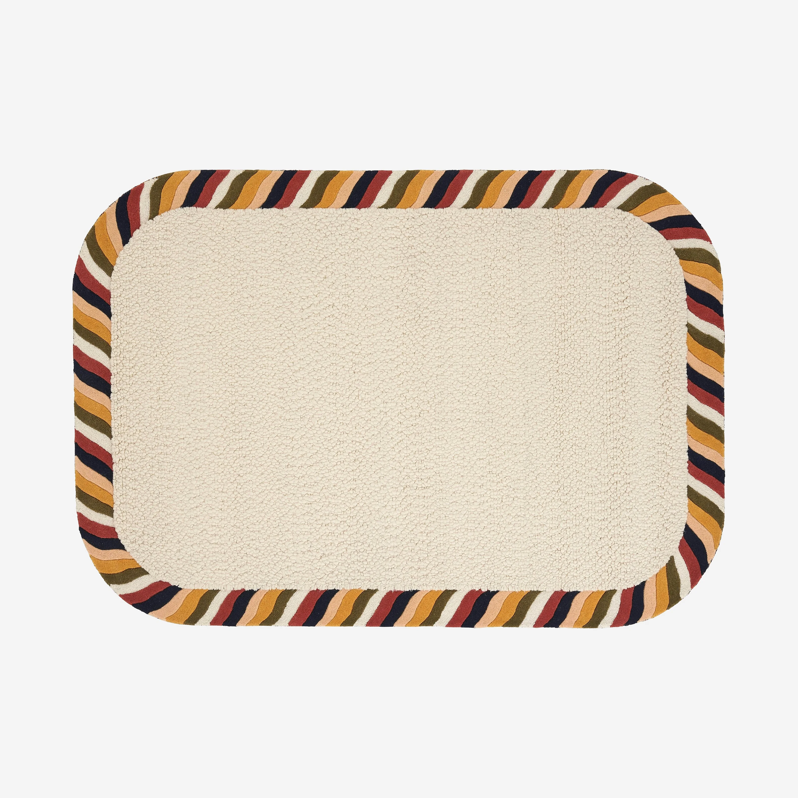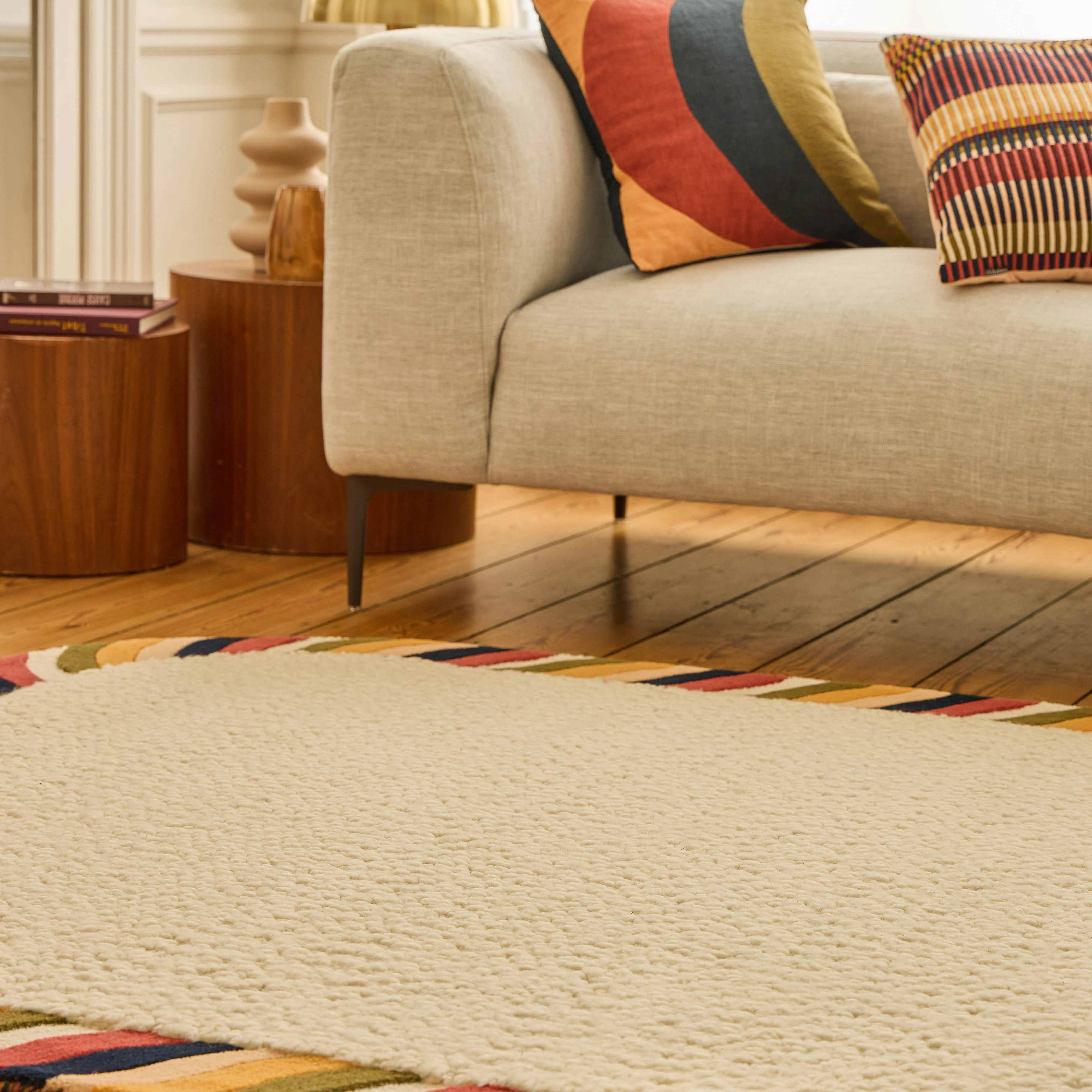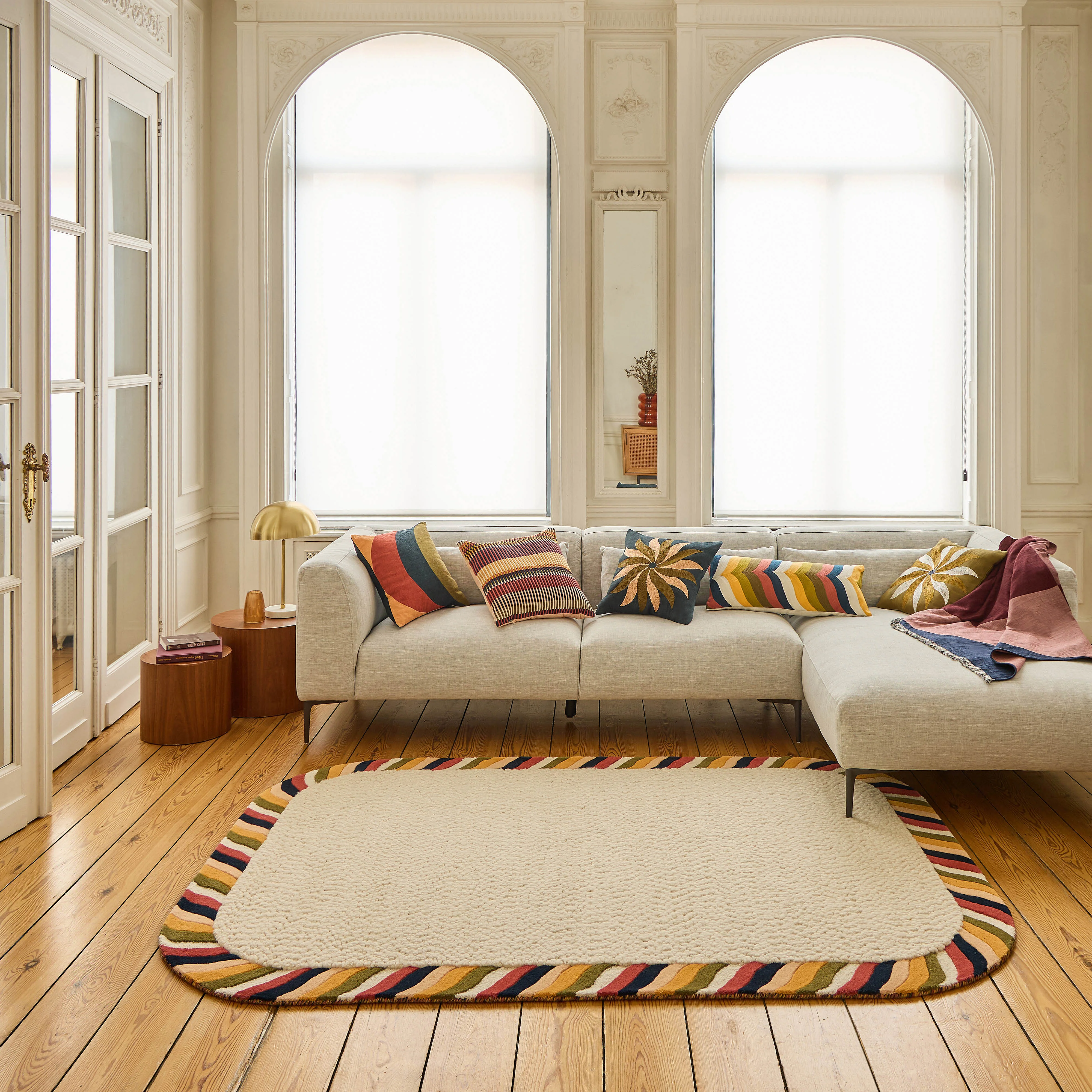 Le tapis Castille en laine tuftée à la main se distingue par un motif graphique discret soulignant les contours, pour une élégance douce et intemporelle.