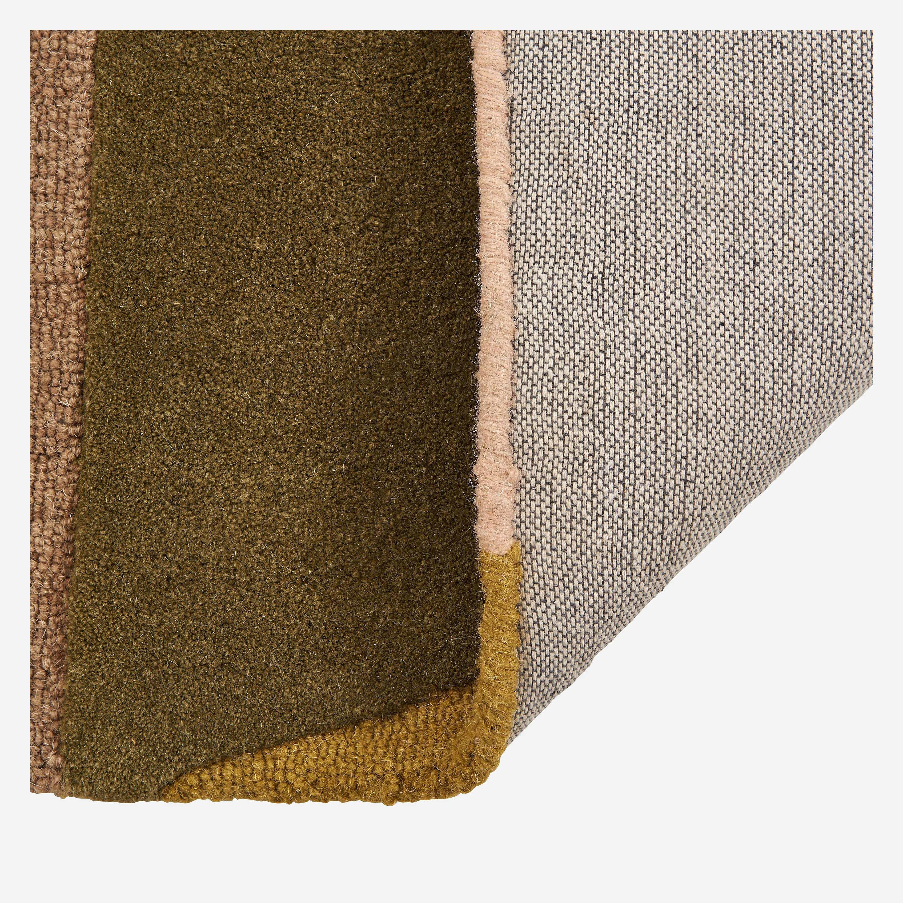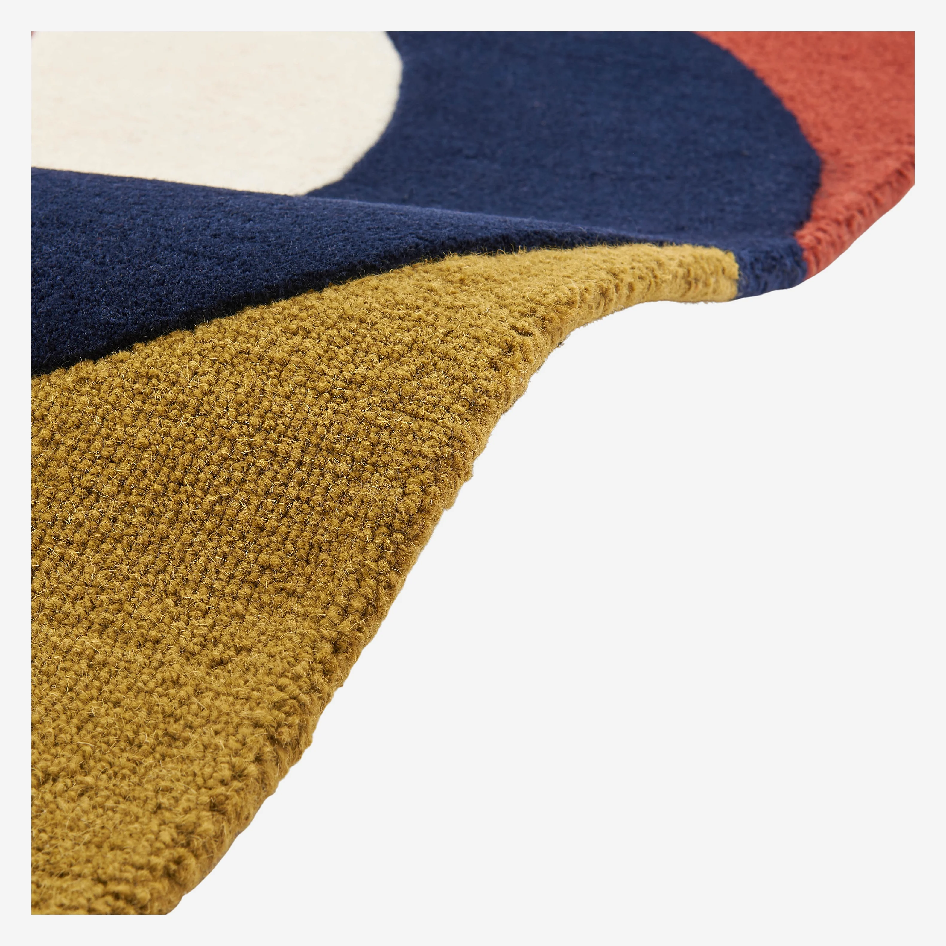 Clarisse insuffle une énergie solaire au salon grâce à ce tapis en laine tuftée et bouclette, mêlant douceur, motif graphique et teinte rosée dans une création signée Floriane Jacques.