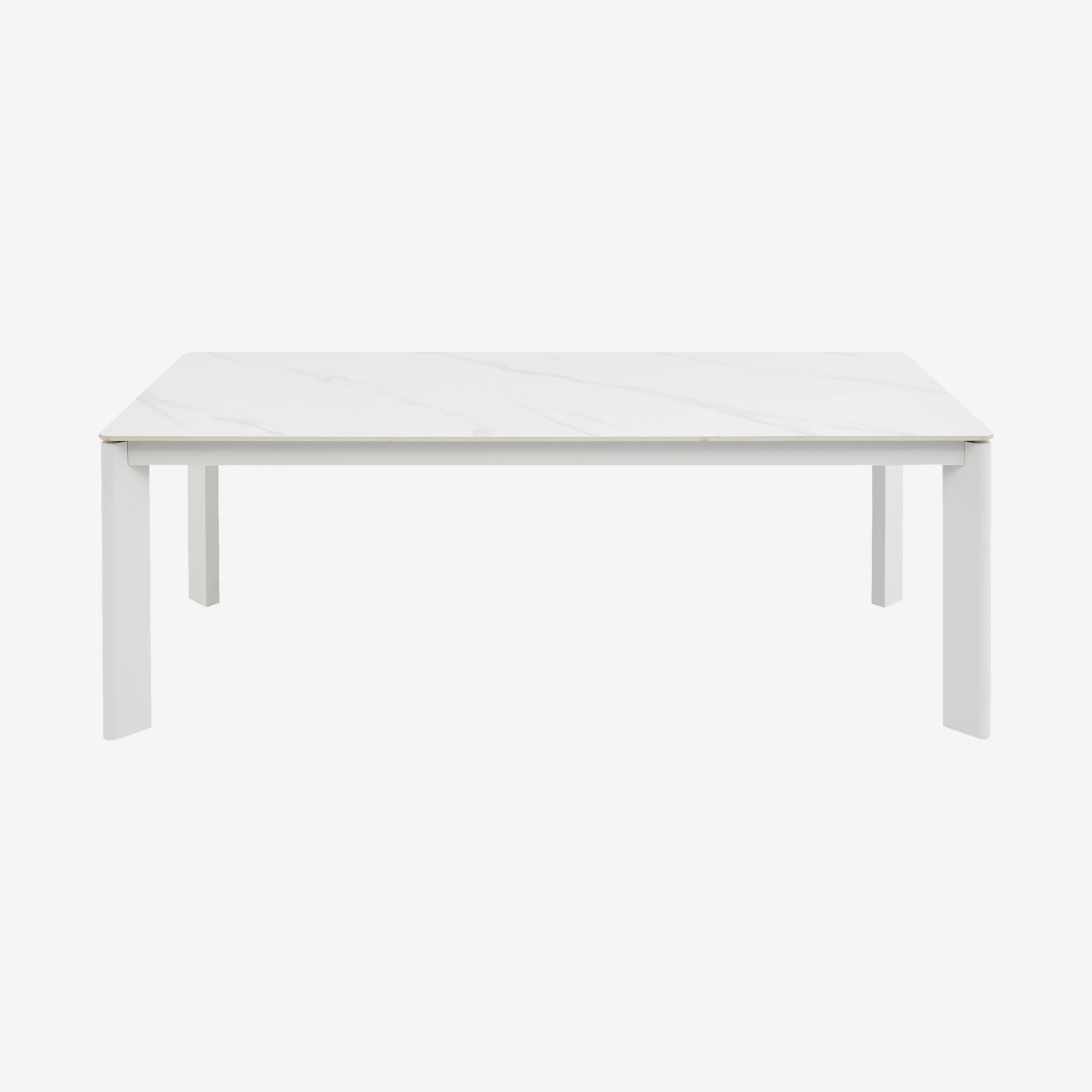 La table Corvo dessine un horizon élégant grâce à ses angles nets et sa silhouette graphique. Son plateau en céramique capture la lumière solaire, offrant une distinction immédiate et une robustesse à toute épreuve pour les repas en extérieur.