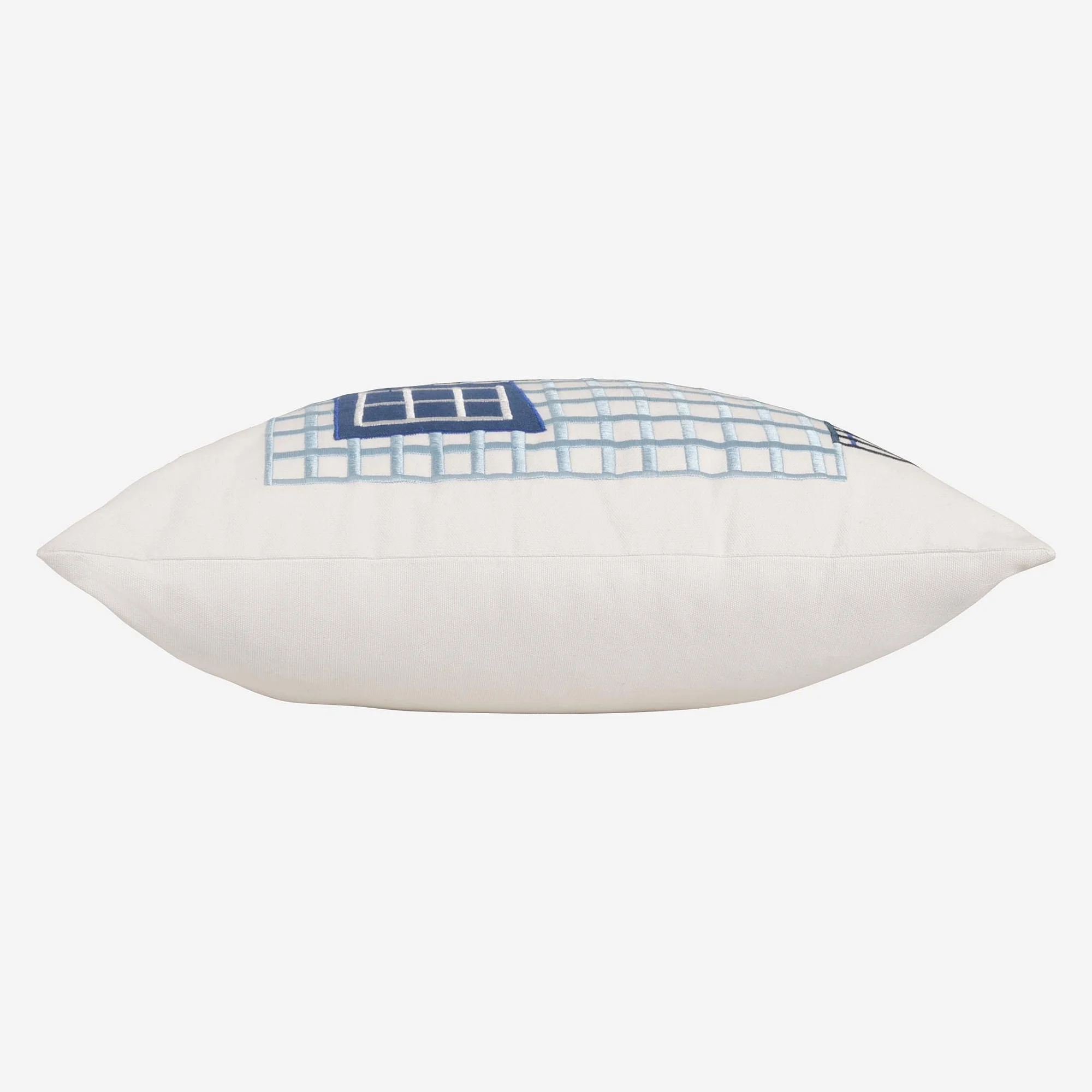 Le coussin Dédale habille votre intérieur de ses broderies bleues profondes, une création poétique et graphique signée Floriane Jacques.