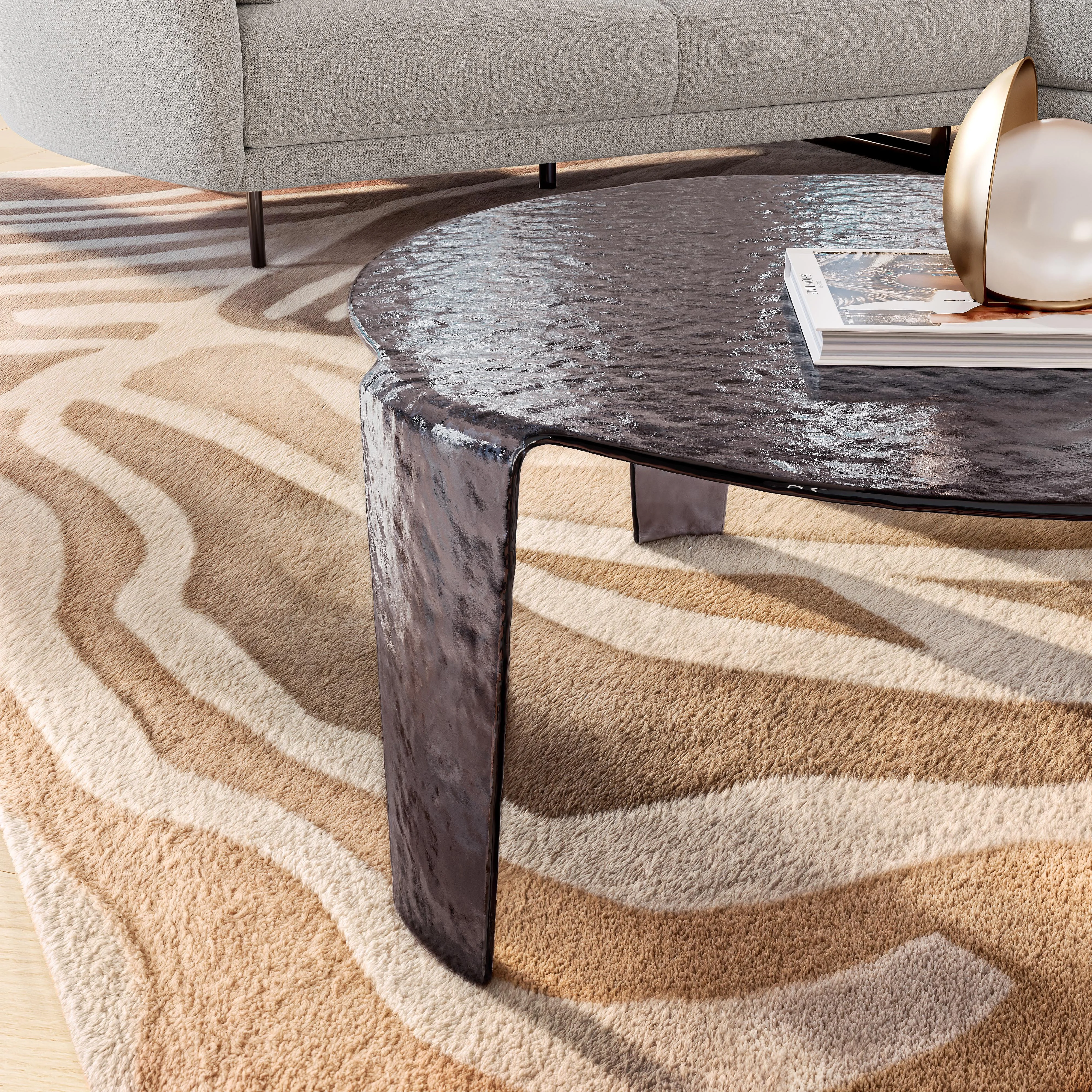 Fegina associe verre bullé teinté, lignes épurées et reflets subtils pour composer une table basse aérienne. Une pièce graphique pensée pour structurer le salon avec élégance.