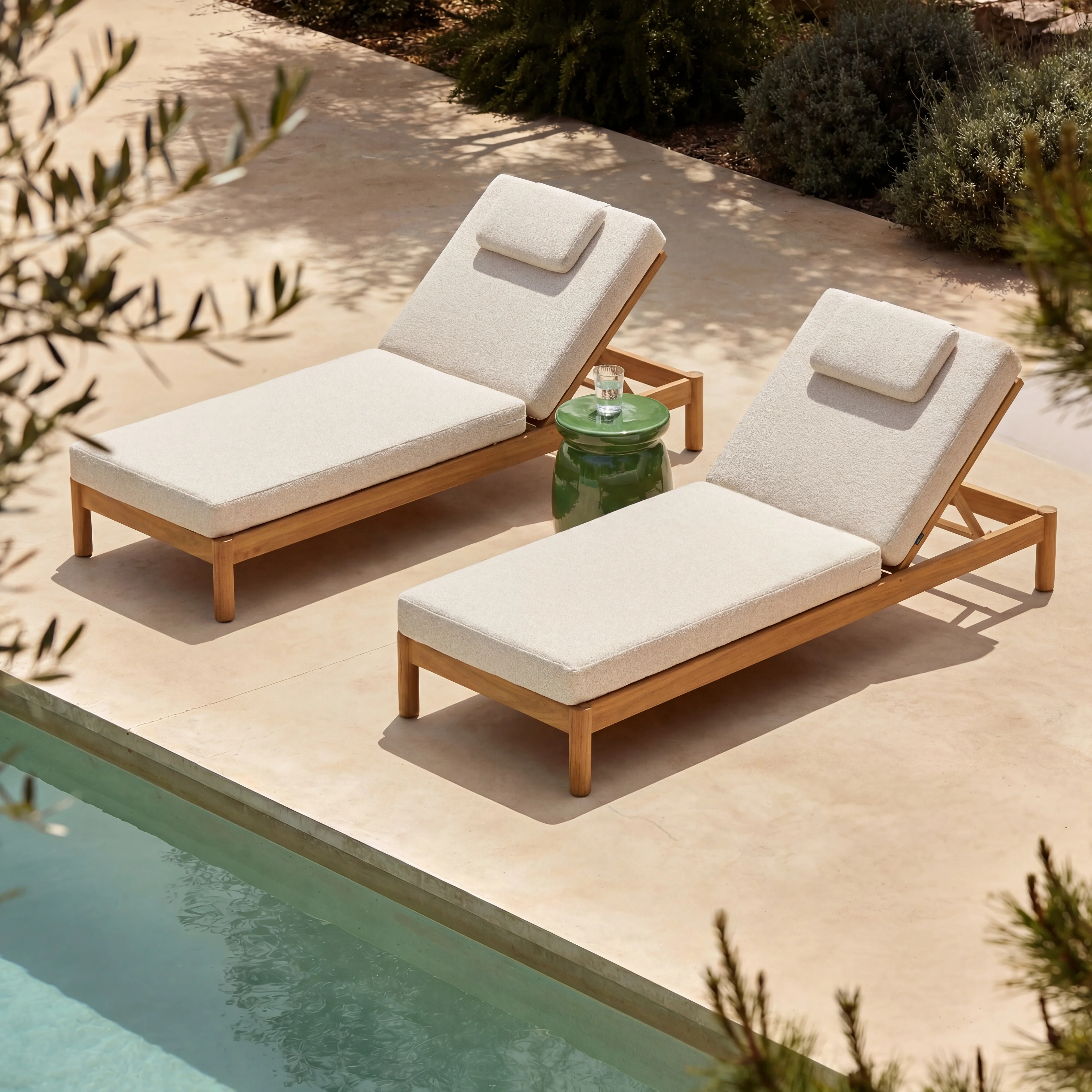 Lot de 2 bains de soleil en teck massif et tissu imperméable - Naturel et blanc cassé