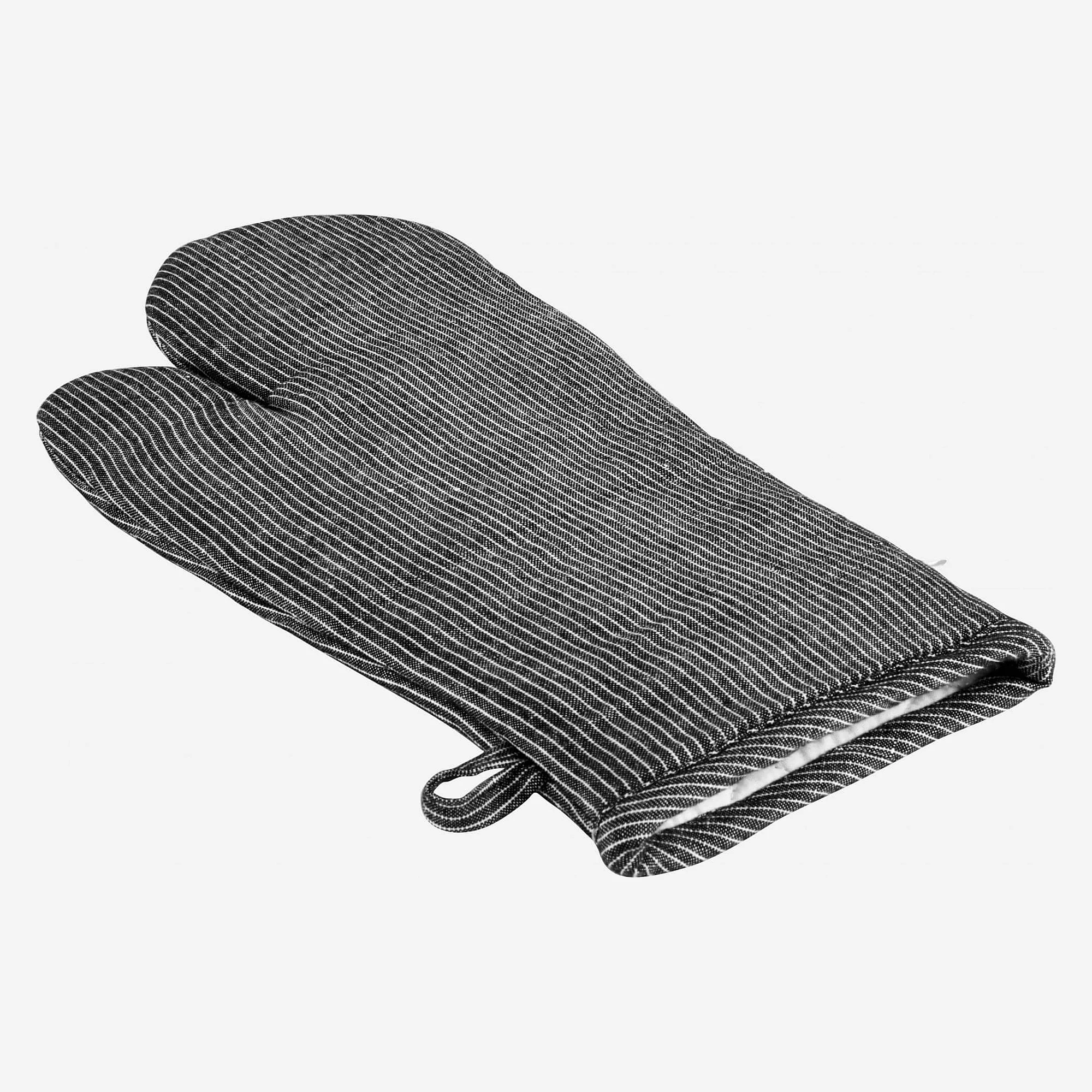 Fitzroy signe un gant de cuisine en coton et lin noir tissé de blanc, alliant élégance intemporelle et protection pratique pour sublimer chaque geste culinaire.