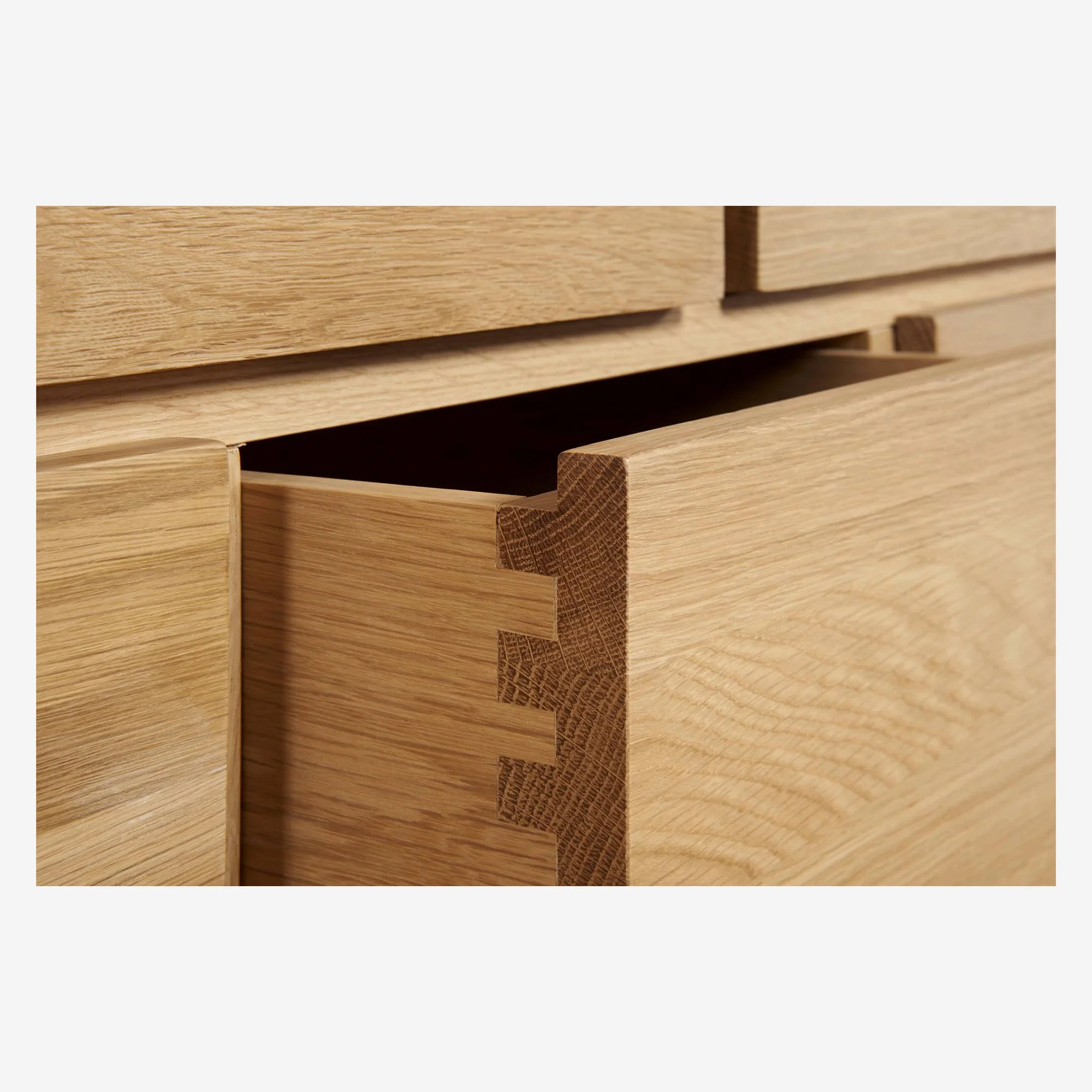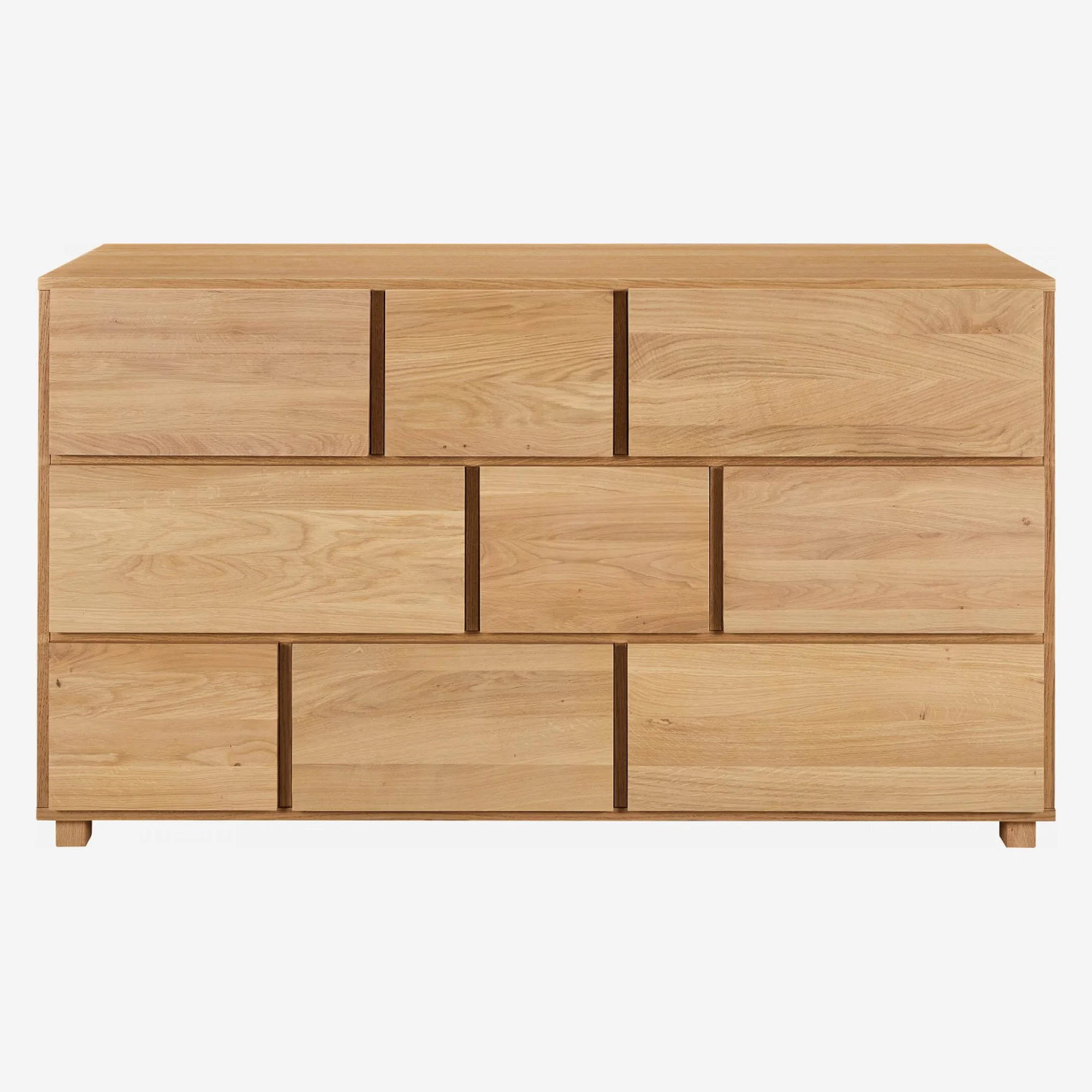 Hanita décline le chêne massif dans une commode à 9 tiroirs aux volumes variés. Un meuble à l’allure épurée, pensé pour une organisation fluide et adaptable à tous les espaces de vie.