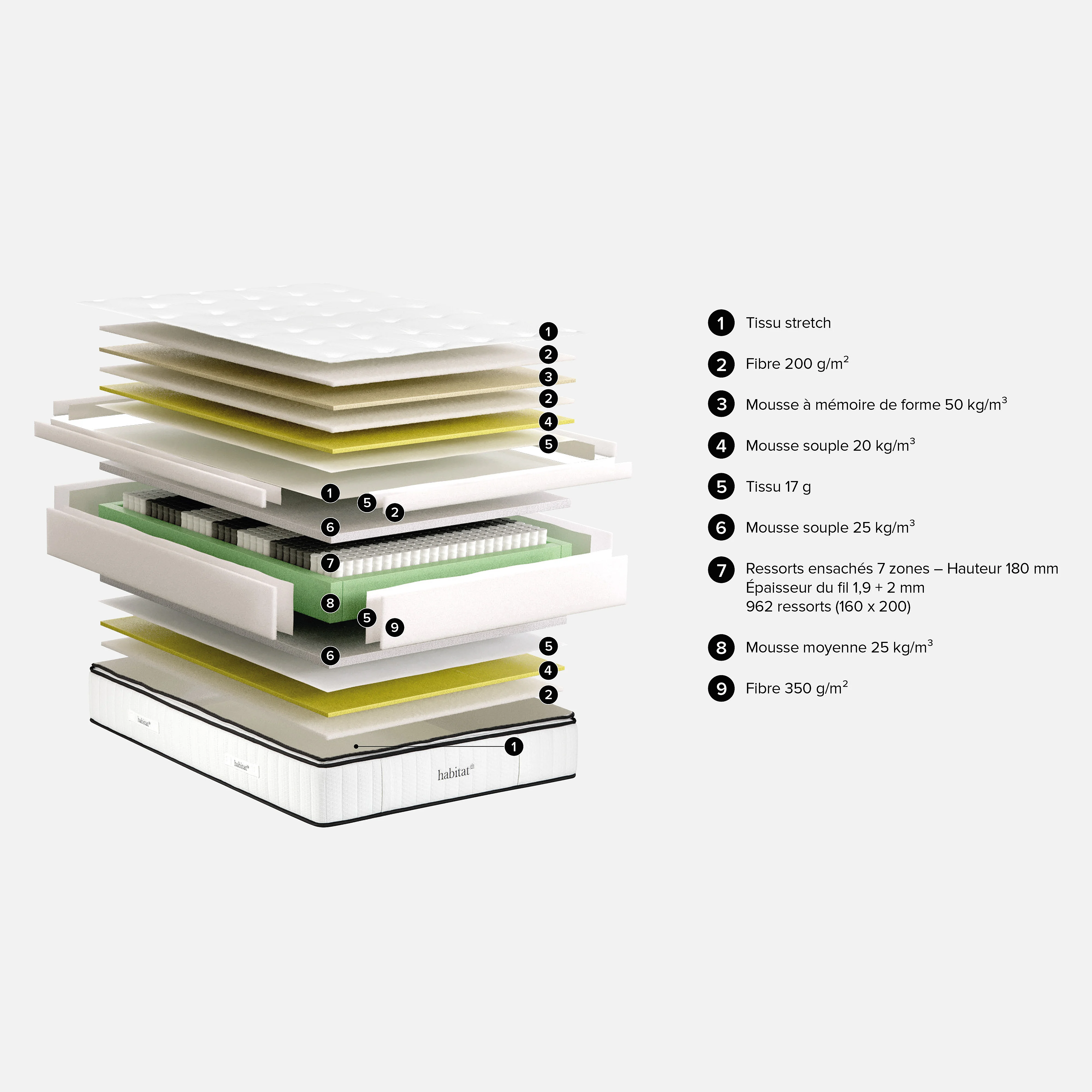Hybride Excellence associe ressorts ensachés, mousse à mémoire de forme et fibres respirantes pour un confort idéal et un soutien équilibré en toute saison. Un matelas avec surmatelas intégré pensé pour un sommeil profond, stable et durable.