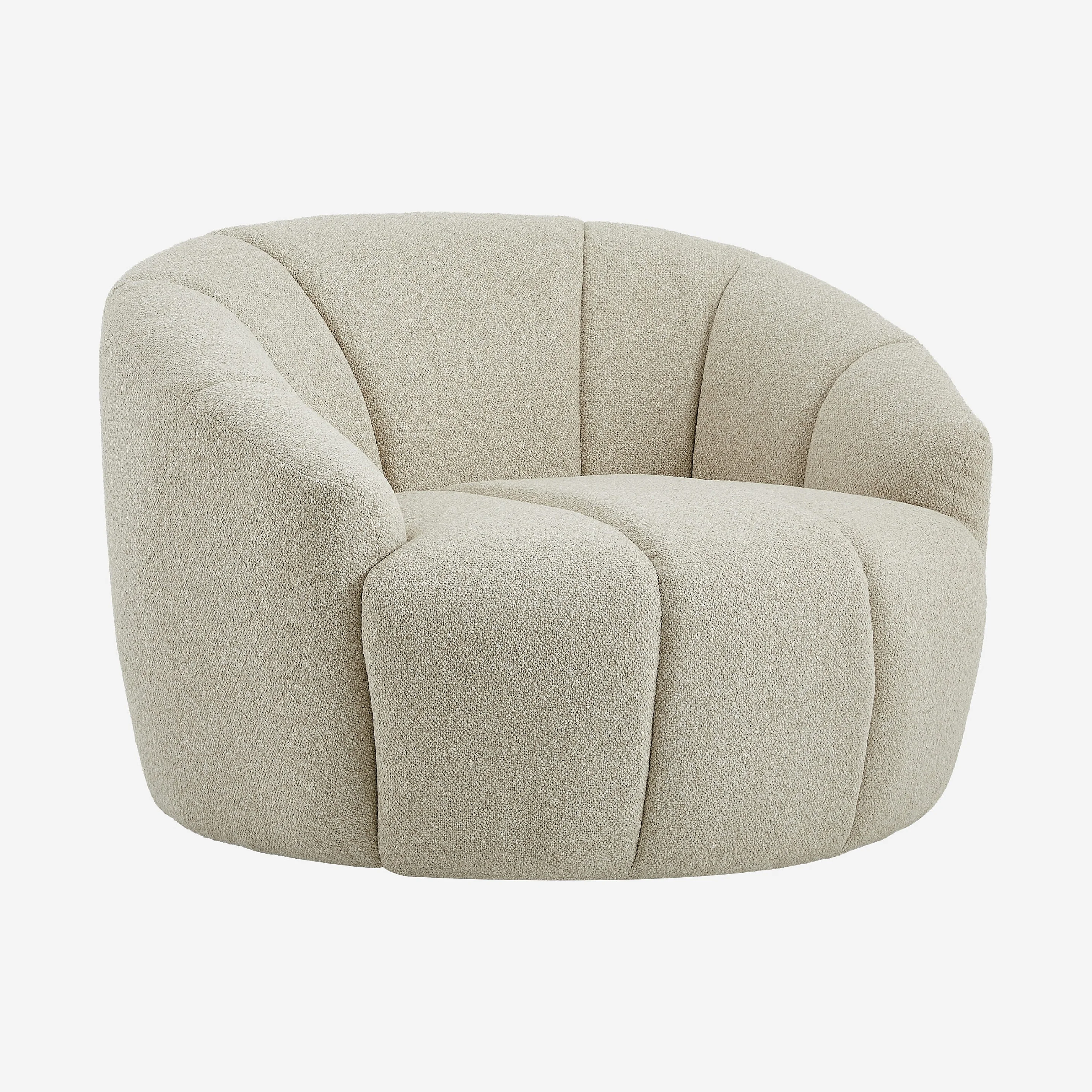 Mayera déploie une silhouette généreuse au design tout en courbes. Une loveuse pivotante en tissu texturé, pensée pour conjuguer confort immersif et allure contemporaine.