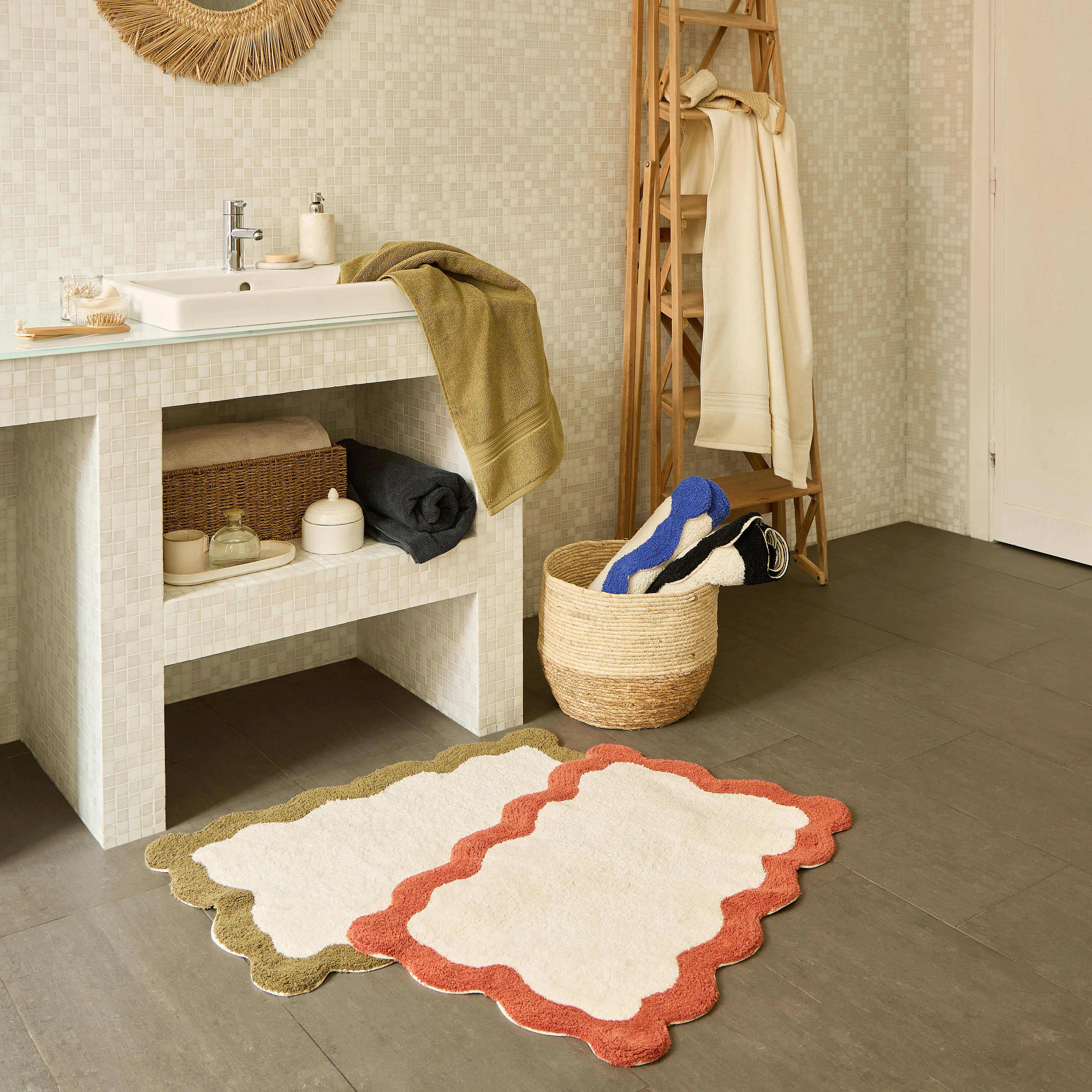 Avec son coton naturel épais et son feston chromatique, le tapis de bain Nahia offre un équilibre subtil entre confort moelleux et aborption rapide.