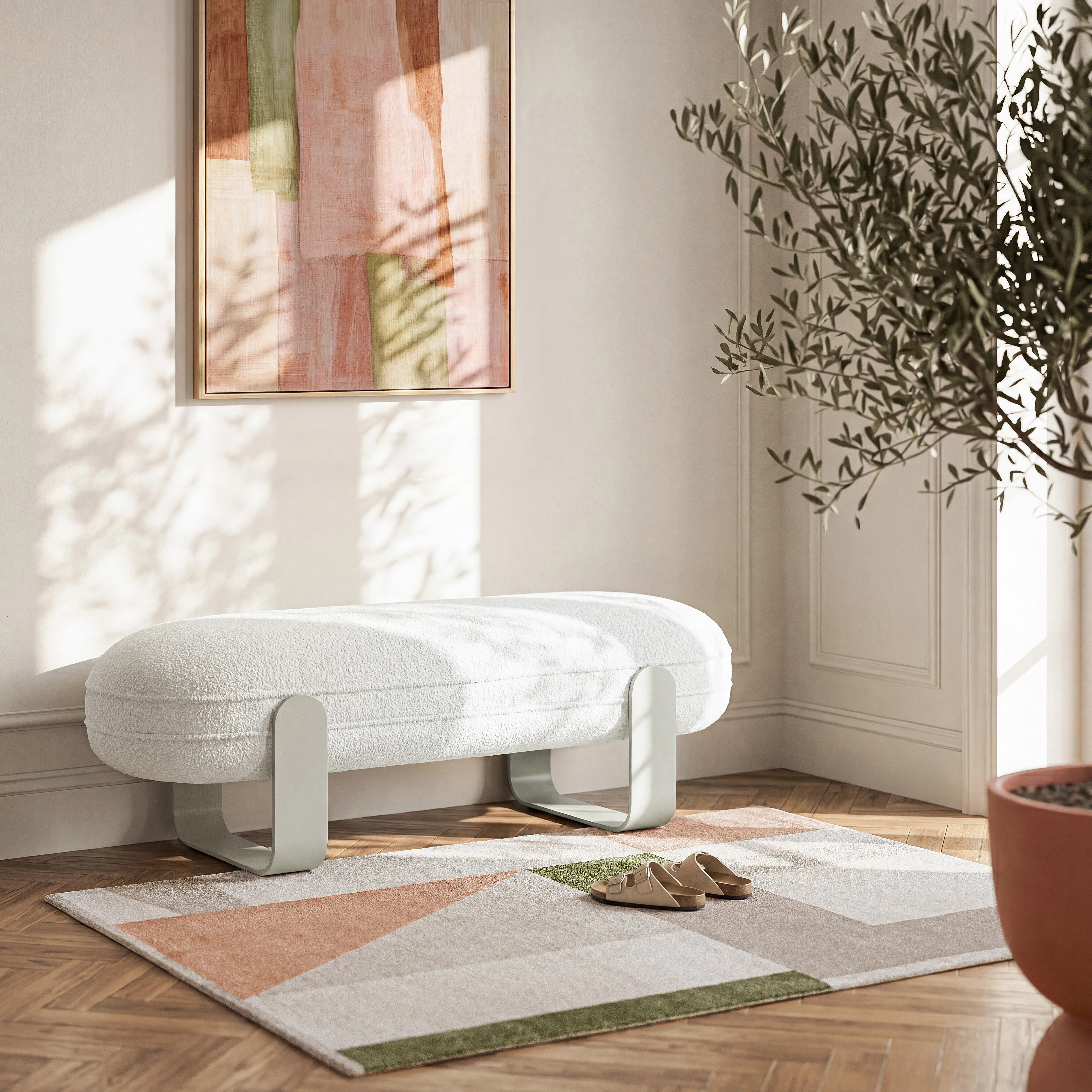 Norala associe une assise en bouclette à des pieds en métal aux lignes graphiques, pour un banc à l’allure contemporaine qui apporte élégance et modernité à l’entrée, à la chambre ou au salon.