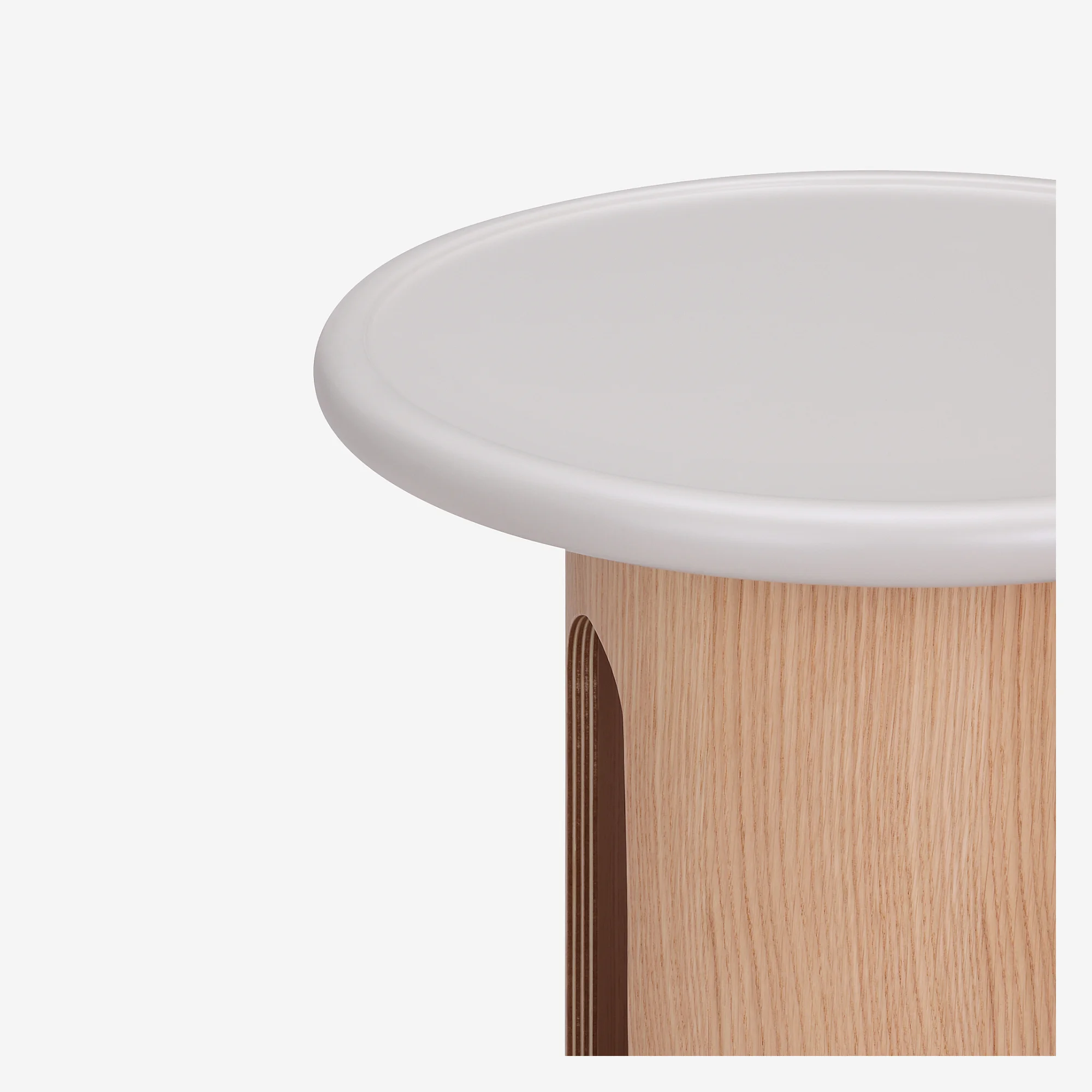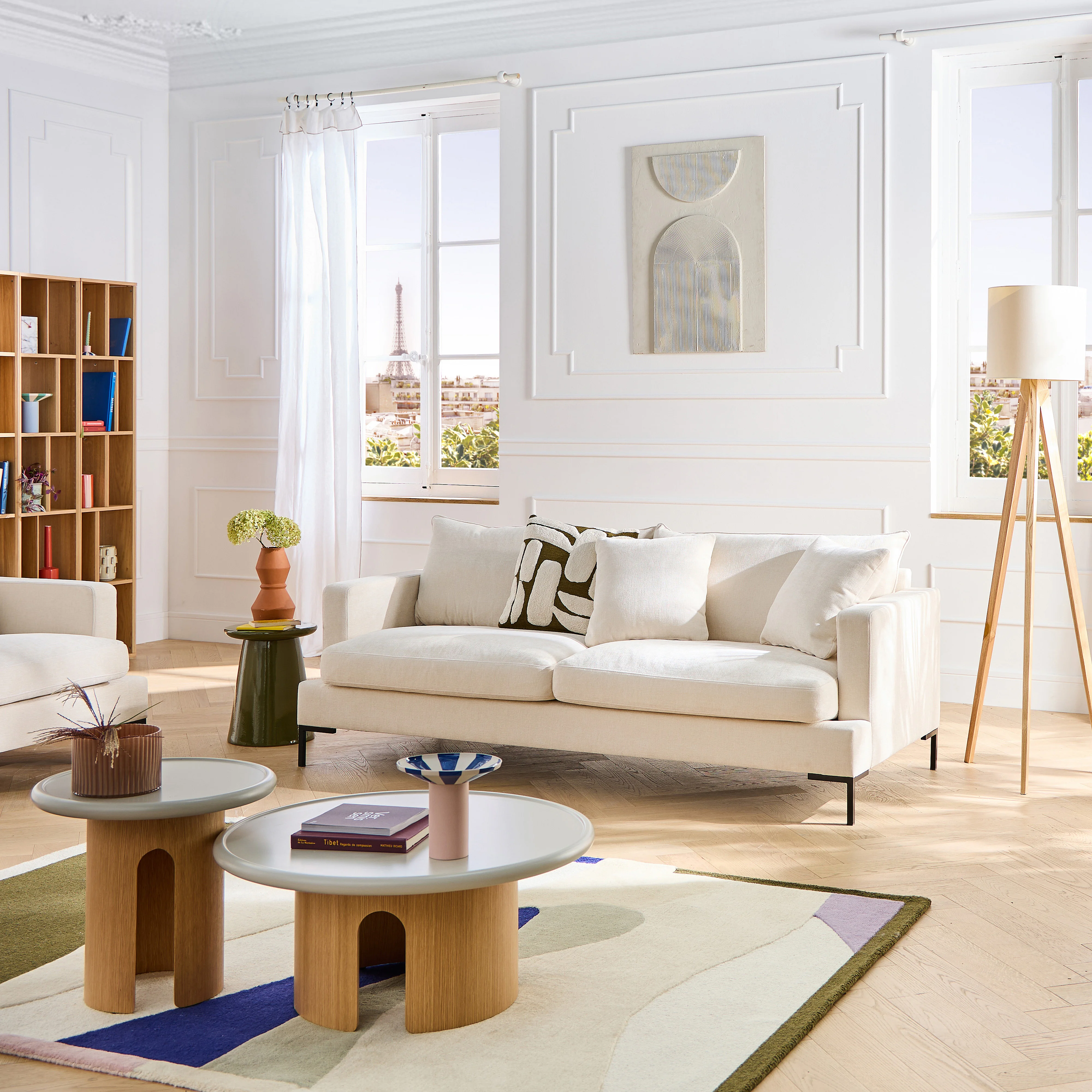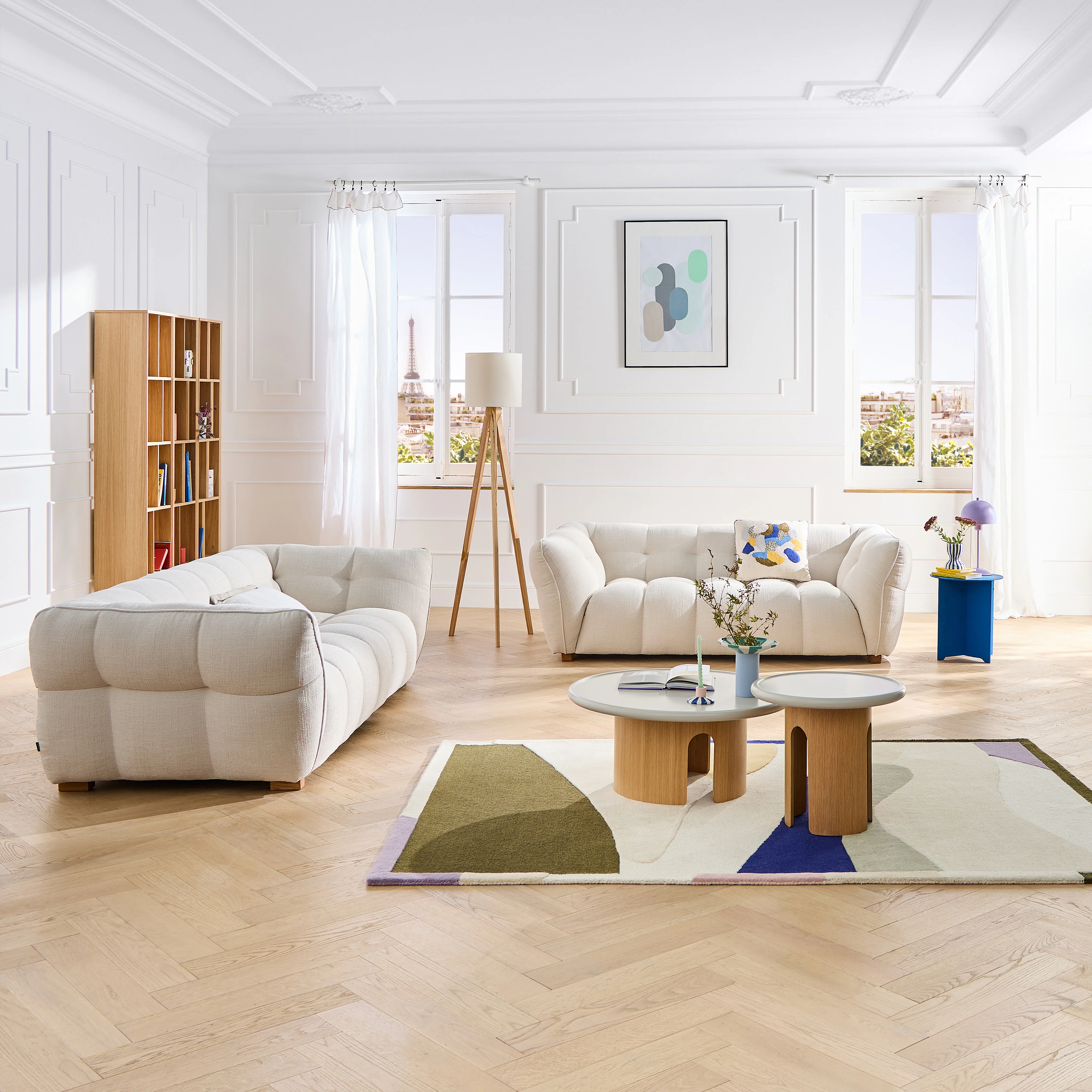 Pimoda joue sur les contrastes entre bois clair et couleur mate pour dessiner une table basse compacte au style affirmé. Une pièce graphique et organique qui structure le salon avec légèreté.
