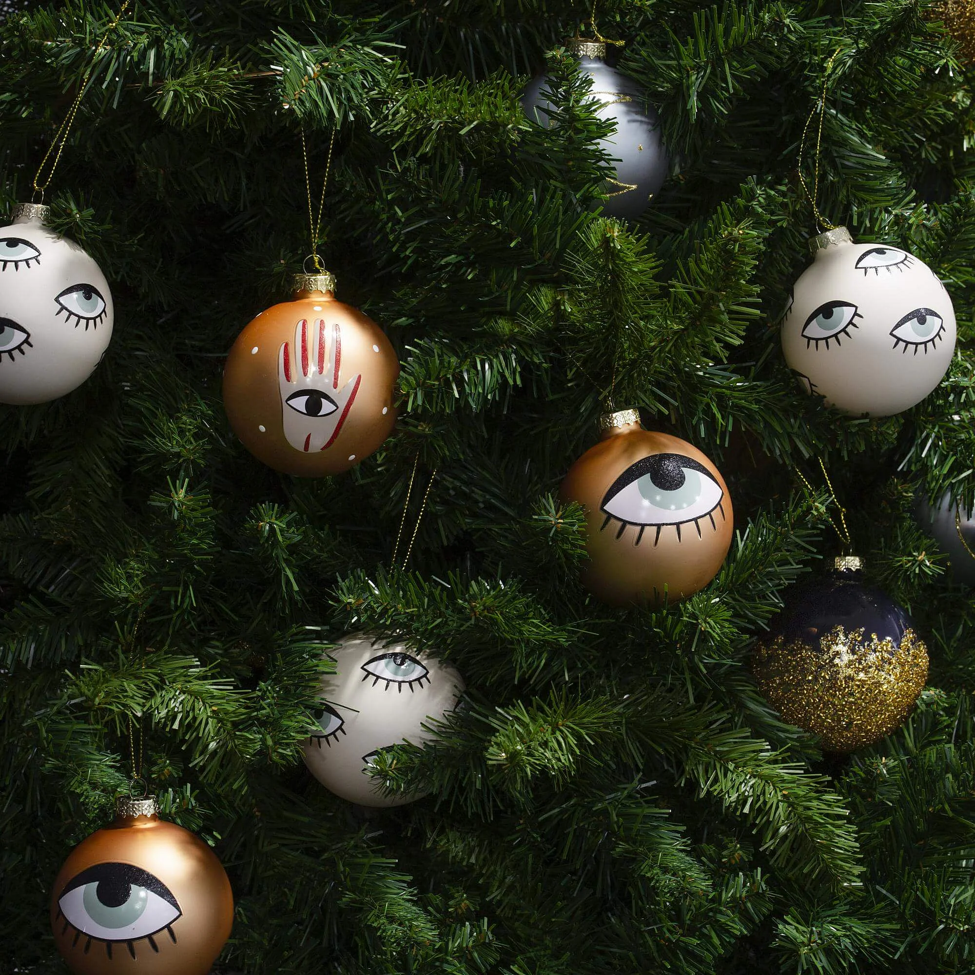 Tasha apporte une touche fantaisiste à vos fêtes avec ces boules de Noël en verre rose ornées d’un motif graphique.