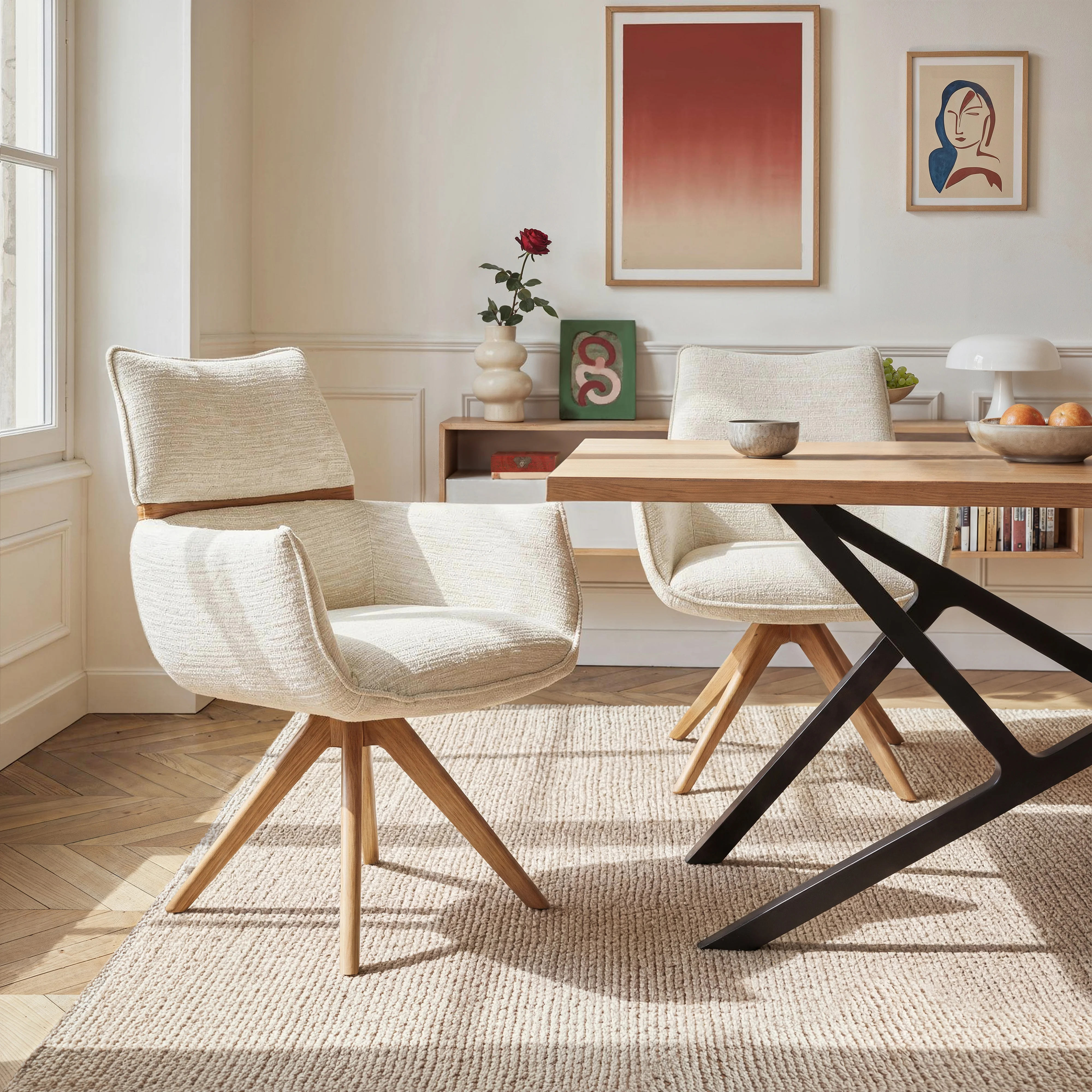 Chaise pivotante en tissu et chêne avec accoudoirs - Crème