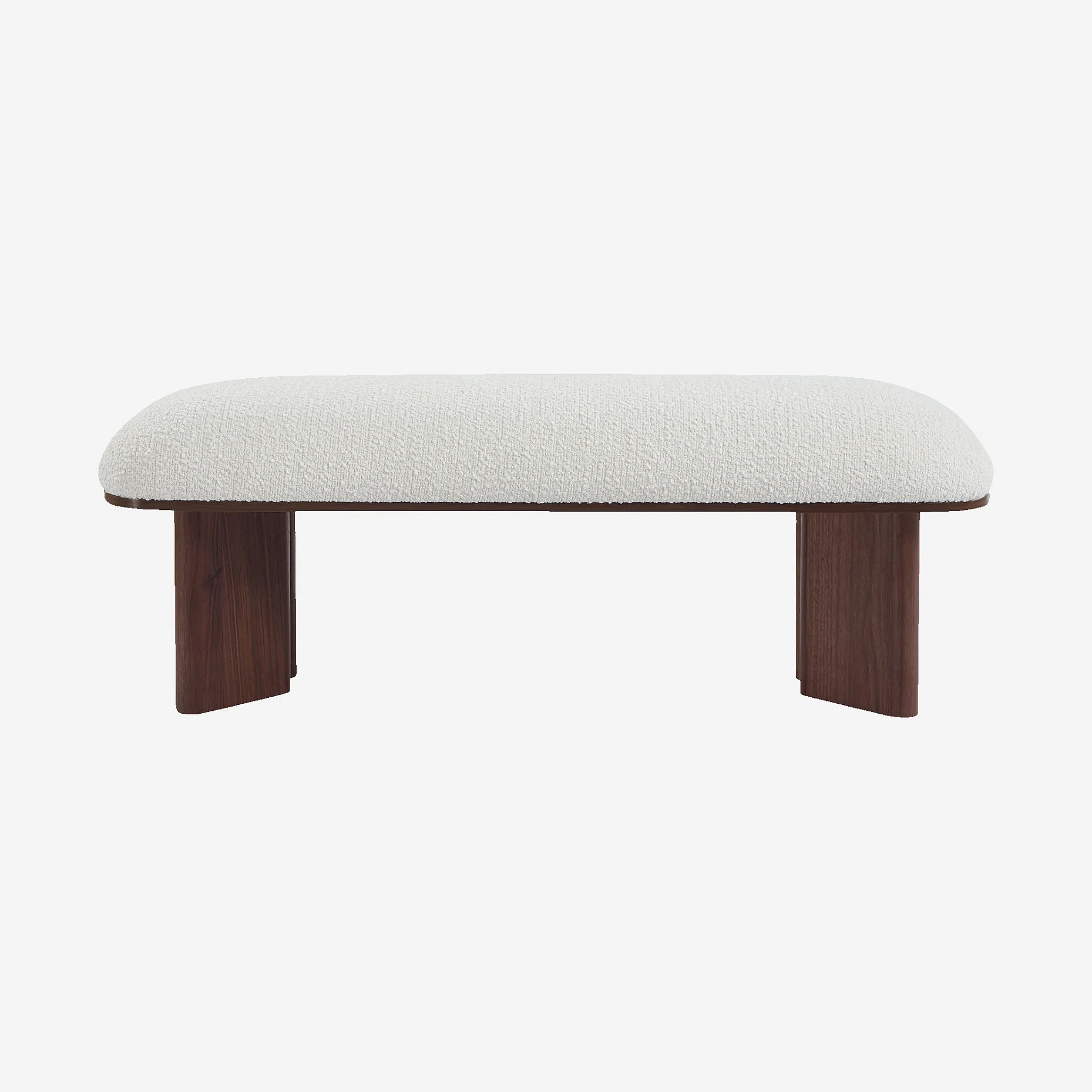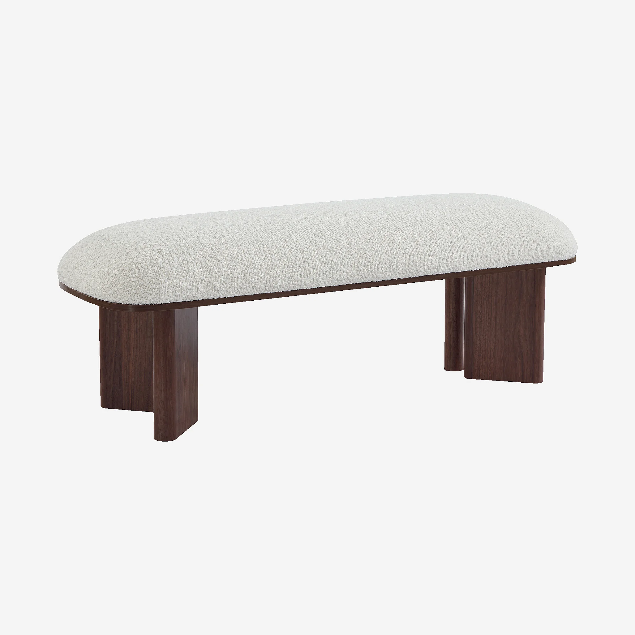 Varna associe une assise en bouclette douce à des pieds en bois de noyer, pour un banc à la fois confortable et élégant qui apporte une touche chaleureuse à l’entrée, à la chambre ou au salon.